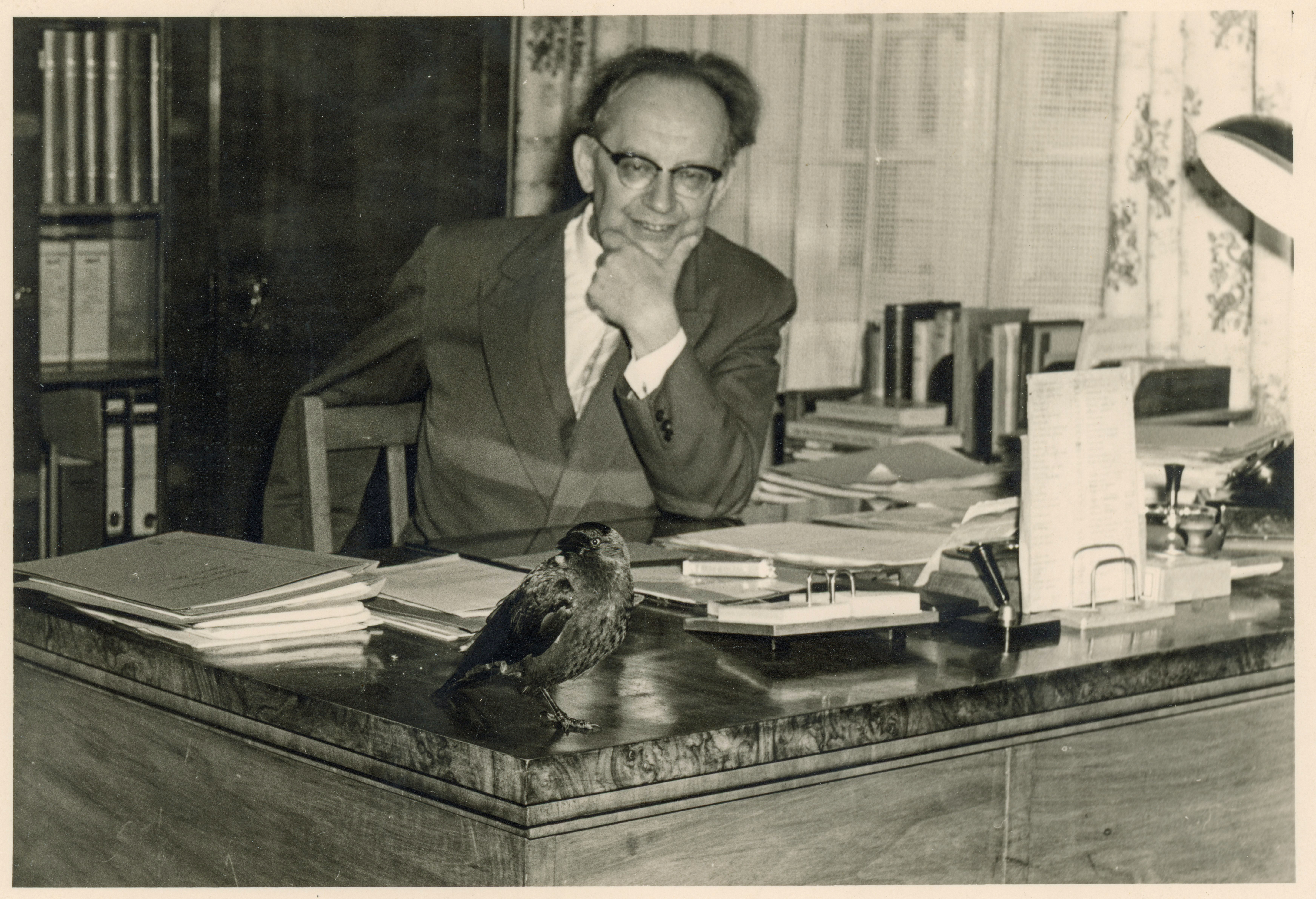 | Beschreibung | Die diebische Dohle Hansi aus dem Stadtpark beim Polizeichef Kaltenhäuser auf dem Schreibtisch, Sept. 1960 | ||