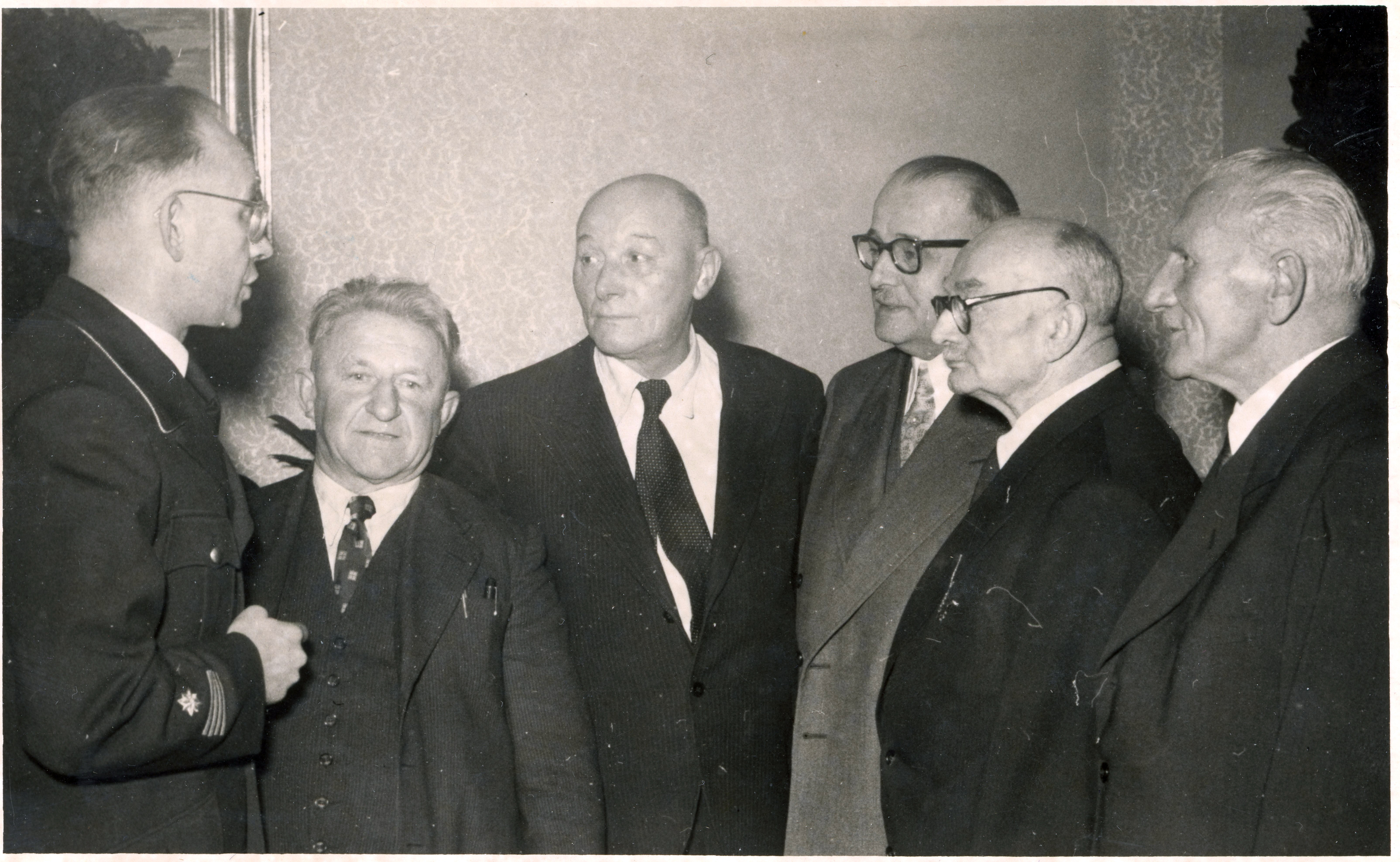 | Beschreibung | Verkehrswachtehrung mit Dr. Anton Kaltenhäuser und OB Hans Bornkessel, laut Rückseite mit im Bild Max Rögner, K. Thiel, Fahrlehrer Gregor Nov. 1952 | ||