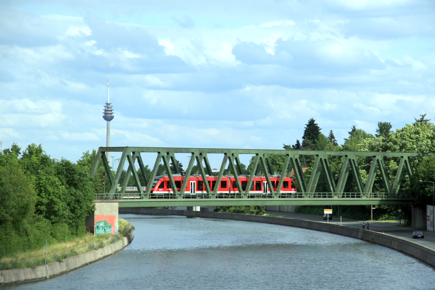 | Beschreibung | Der Main-Donau-Kanal - Blick Richtung Osten, im Hintergrund die Brücke der Rangaubahn und der Fernsehturm in Nürnberg | ||