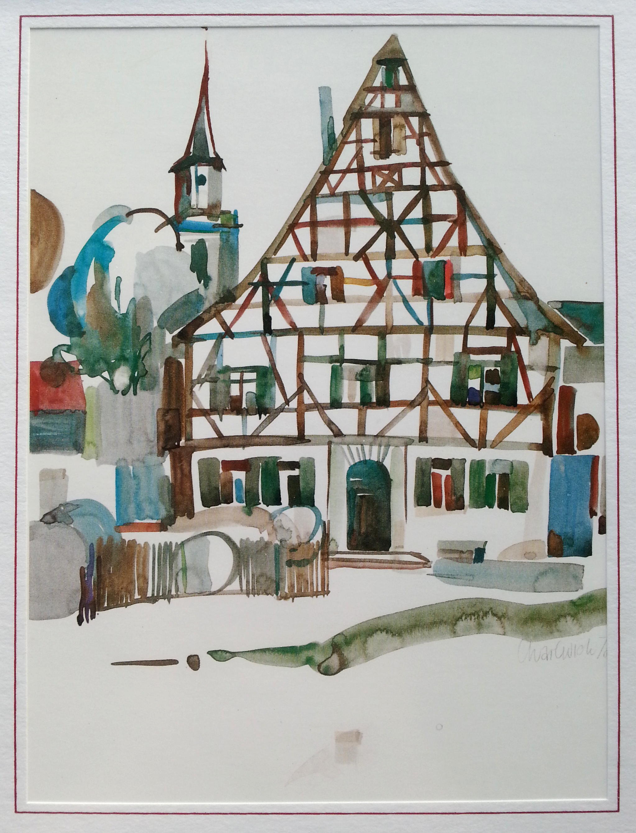 | Beschreibung | Karl-Heinz Wich: "Pfarrhof St. Michael", Kunstdruck (im Original Aquarell). Signiert mit CharlWich 78, Kunstmappe des Lions Club Fürth, 1983 | ||