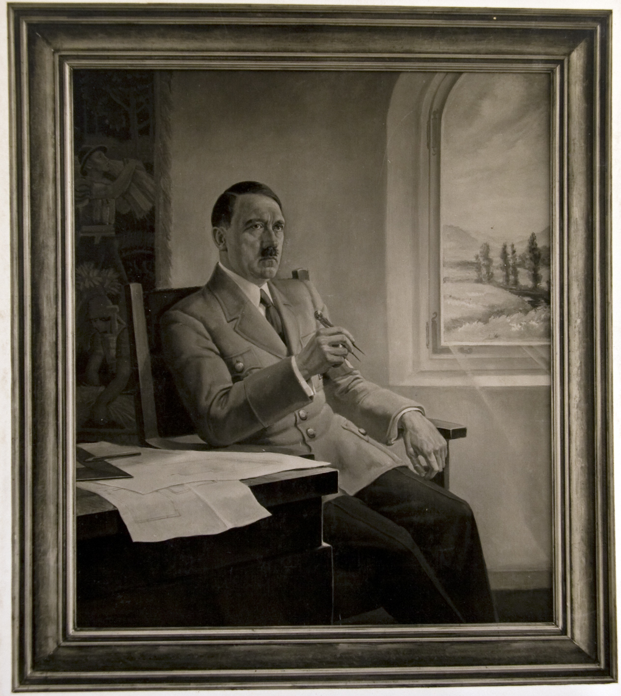 | Beschreibung | Porträt Adolf Hitlers, gemalt von Karl Hemmerlein - Geschenk der Stadt Fürth an den ehem. OB Jakob zum Abschied nach Thorn (Aufnahme von 1942) - Adolf Hitler als "Baumeister des 3. Reiches" | ||