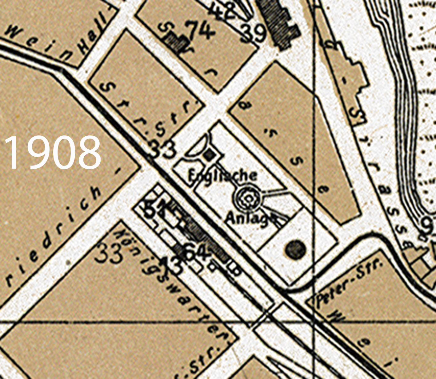 | Beschreibung | Kartenausschnitt aus einem Stadtplan von 1908 - gut zu erkennen die Struktur der Englischen Anlage. | ||