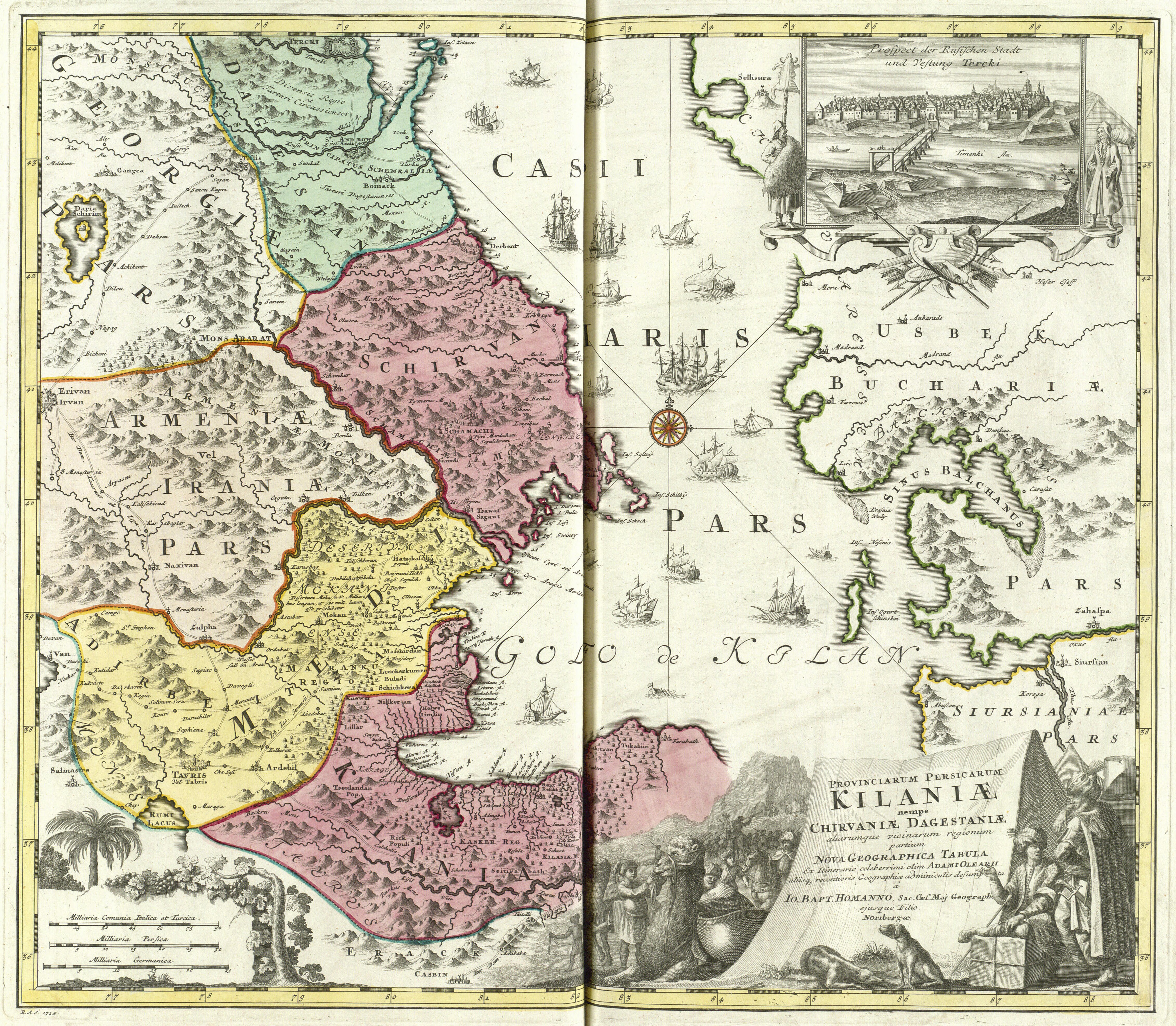 | Beschreibung | "Provinciarum Persicarum Kilaniæ nempe Chirvaniæ, Dagestaniæ aliarumque vicinarum regionum partium nova geographica tabula", Nürnberg 1728 | ||