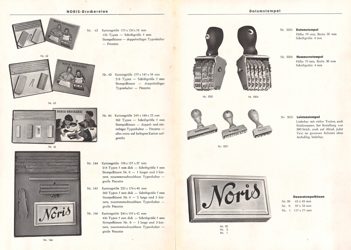 | Beschreibung | Produktkatalog der Fa. Noris-Spiele, Seite 1 u. 16, ca. 1955 | ||