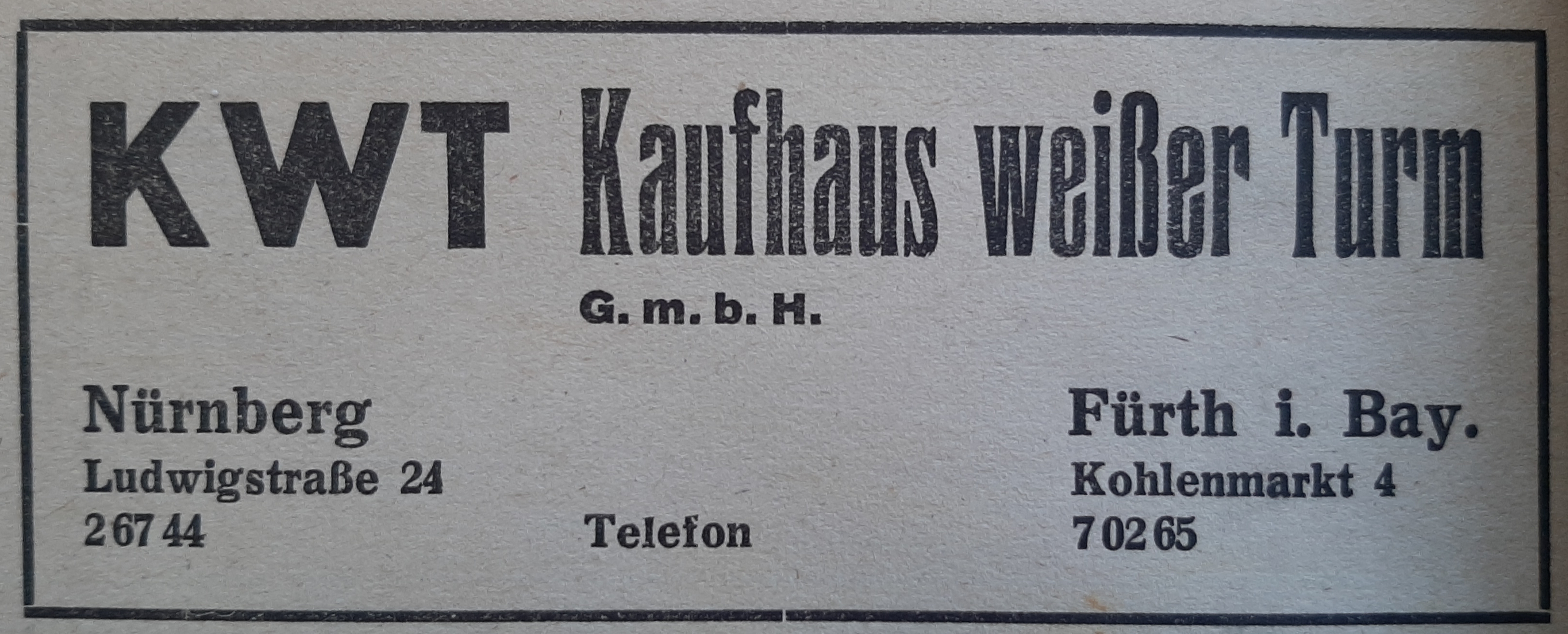 | Beschreibung | Werbeanzeige für das Kaufhaus Weißer Turm, 1949 | ||