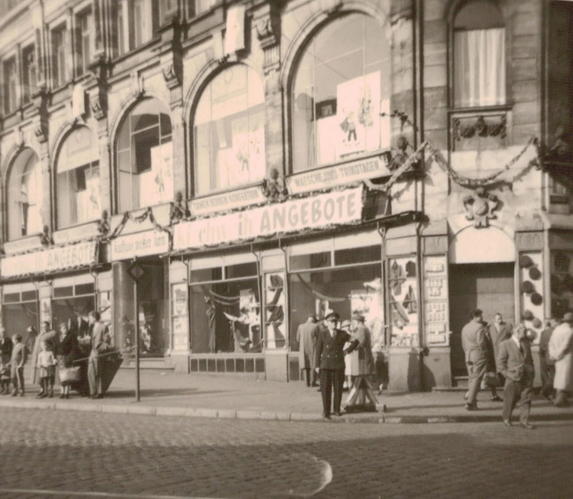 | Beschreibung | Das Kaufhaus Weißer Turm mit Kirchweihangeboten, ca. 1955 | ||