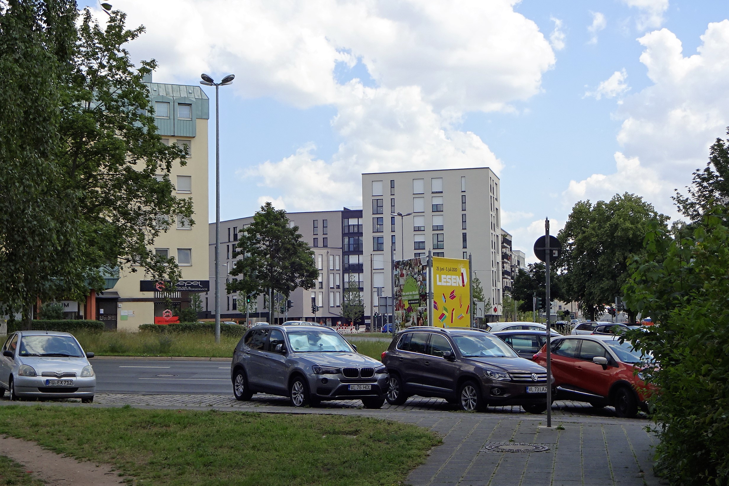 | Beschreibung | Blick von der Erlanger Straße zur Wohnanlage Kavierlein an der Poppenreuther Straße und Espanstraße. Links angeschnitten Geschäftshaus Erlanger Straße 32, im Juni 2020 | ||