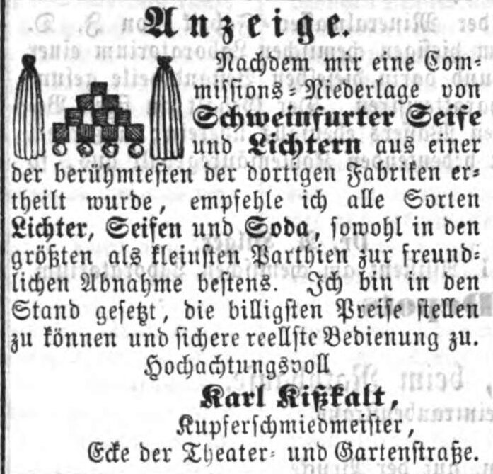 | Beschreibung | Zeitungsanzeige des Kupferschmiedmeisters Karl Kißkalt, August 1863 | ||
