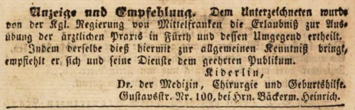 | Dateiinfo (Bild-Unterschrift und Info-Box, automatisch erstellt) | Zeitungsanzeige des Arztes Karl Kiderlin, Dezember 1842 Lizenz: NoC-NC 1.0 | ||
