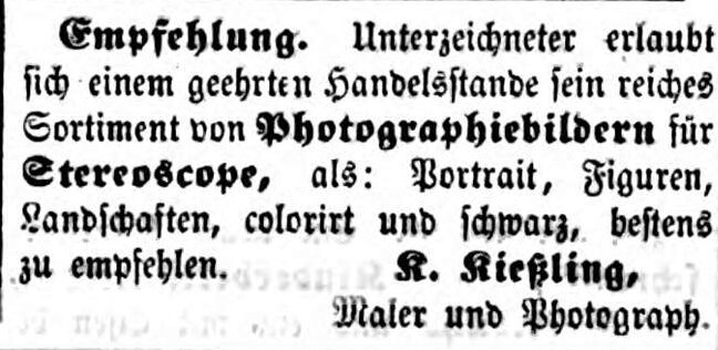 | Dateiinfo (Bild-Unterschrift und Info-Box, automatisch erstellt) | Zeitungsanzeige des Porzellanmalers und Photographen Konrad Kießling, Juni 1856 Lizenz: NoC-NC 1.0 | ||
