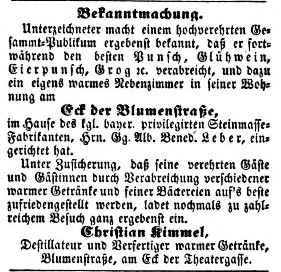 | Beschreibung | Zeitungsanzeige des Wirts Christian Kimmel, Oktober 1853 | ||