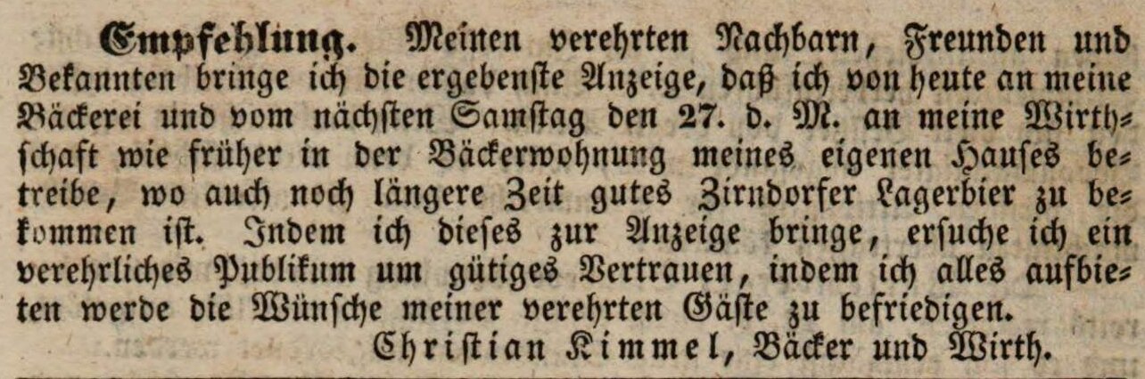 | Beschreibung | Werbeannonce des Bäcker und Wirts Christian Kimmel, Oktober 1838 | ||