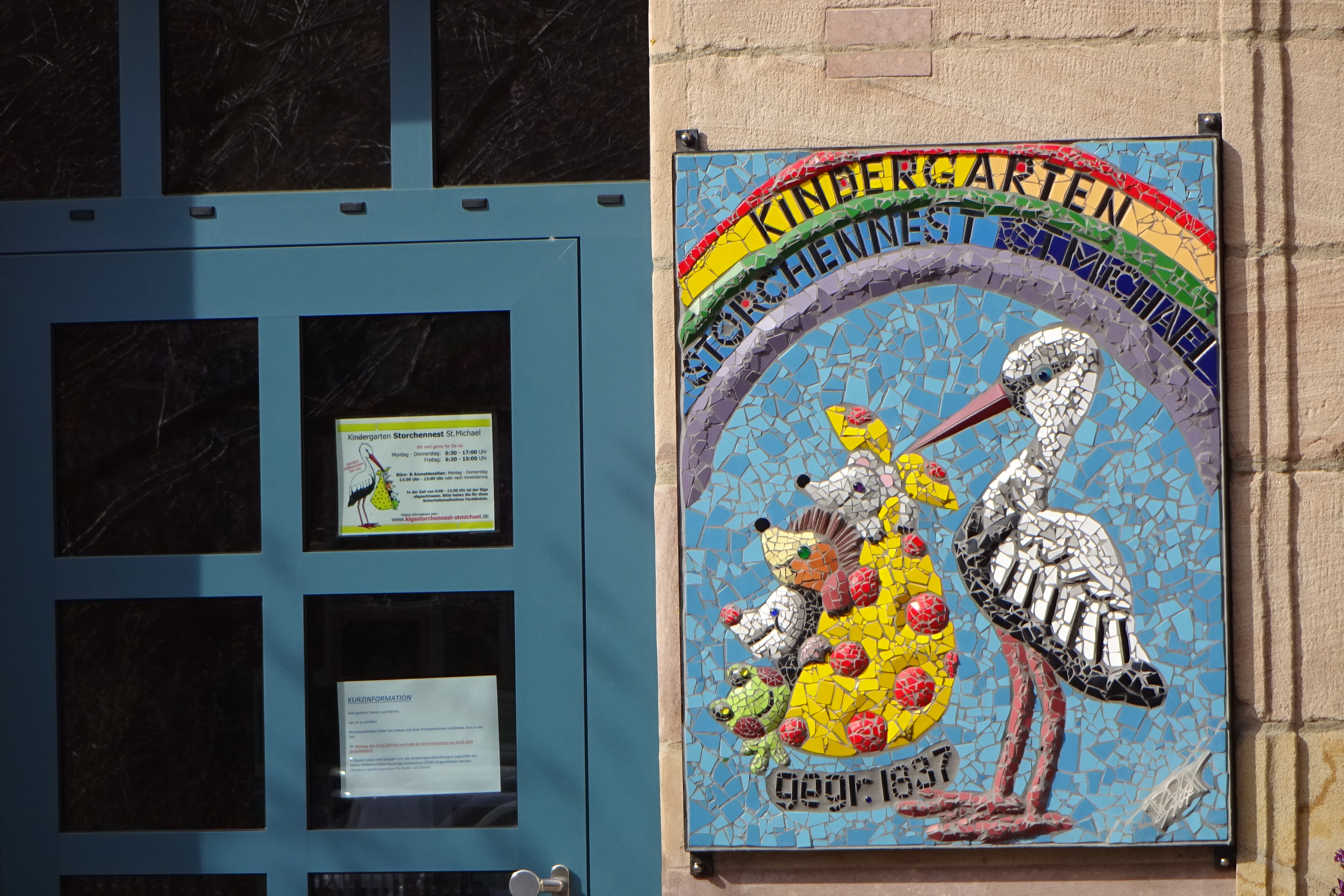 | Dateiinfo (Bild-Unterschrift und Info-Box, automatisch erstellt) | Eingang Evang. Kindergarten Storchennest am Kirchenplatz Urheber: Norbert Pietsch<br><br>Lizenz: CC BY-SA 3.0 | ||