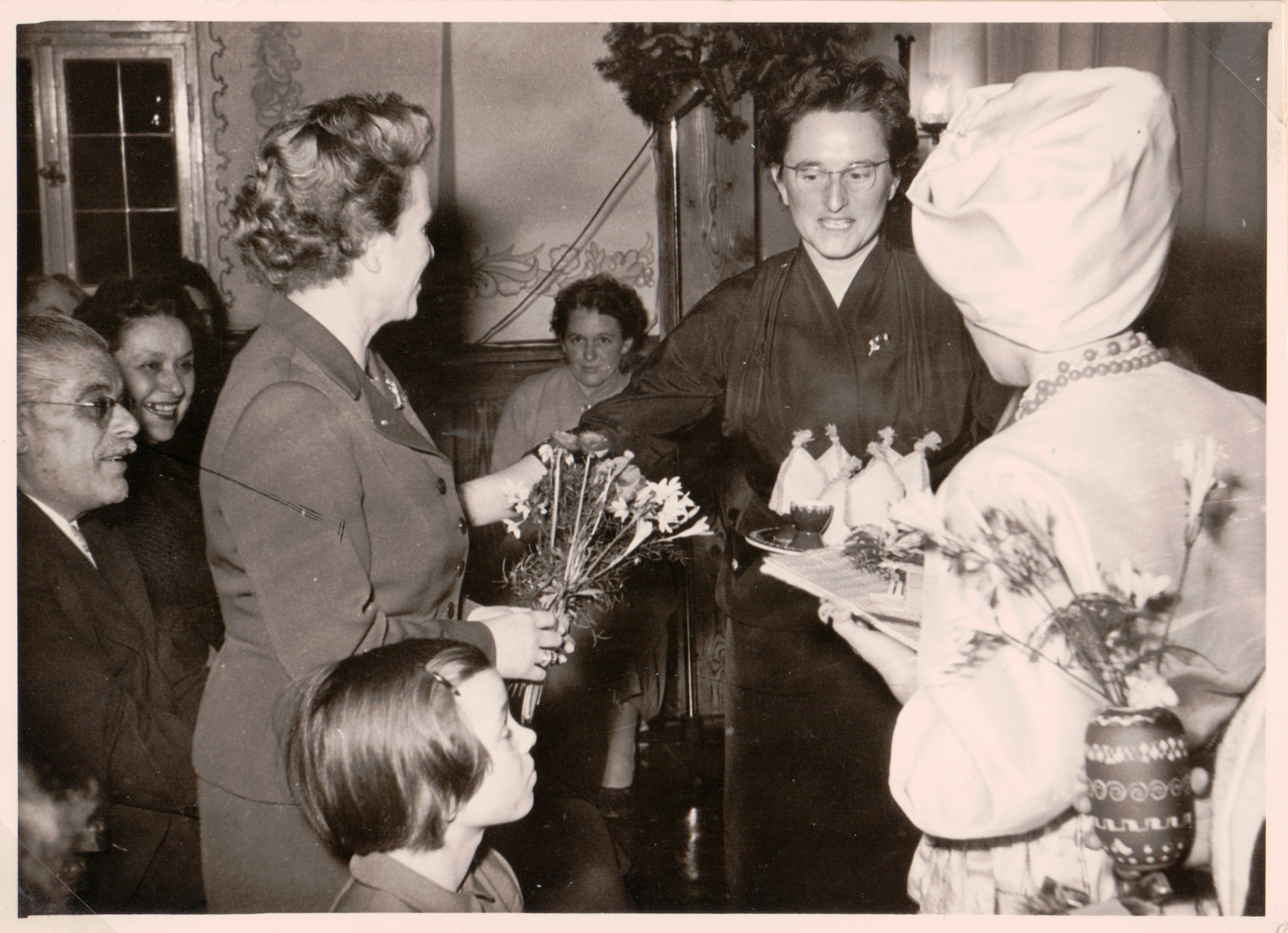 | Beschreibung | Weihnachtsfeier 1954 im Kinderheim Grete Schickedanz. Im Bild links Gustav Schickedanz, daneben Liesl Kießling und mittig stehend Grete Schickedanz mit Heimleiterin Veit | ||
