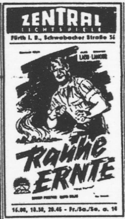 | Dateiinfo (Bild-Unterschrift und Info-Box, automatisch erstellt) | Kino Werbung der Zentral-Lichtspiele vom 31.10.1952 in den Fürther Nachrichten Urheber: Fürther Nachrichten<br><br>Lizenz: CC BY-SA 3.0 | ||