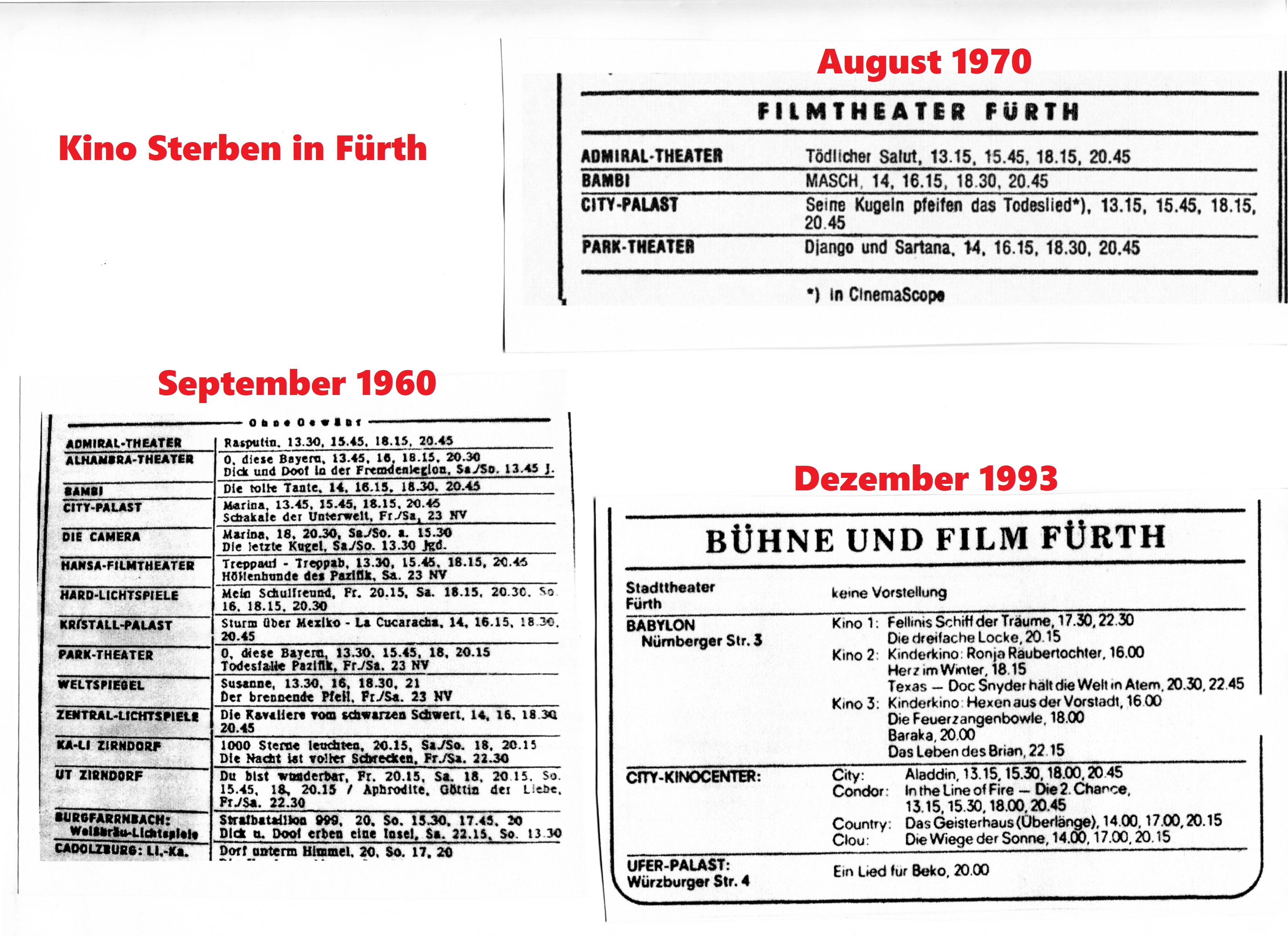 | Beschreibung | Kino-Sterben in Fürth – Kinoanzeigen in den Fürther Nachrichten vom 30. Sept. 1960, Aug. 1970, 1. Dez. 1993 | ||