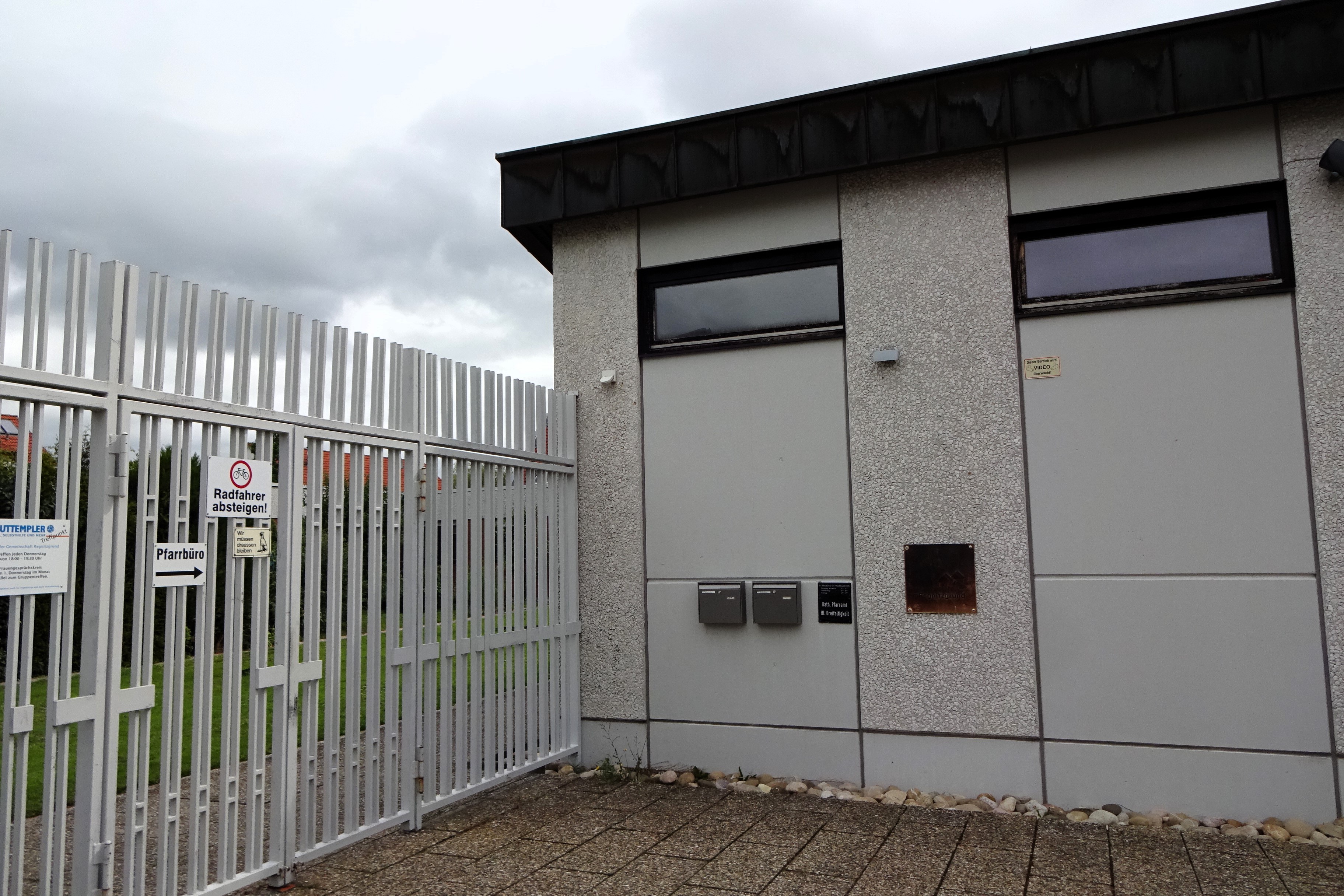 | Beschreibung | Kirche „Heiligste Dreifaltigkeit“ mit Eingang zum Pfarrbüro und Hort 2 des städt. Kindergarten Regnitzgrund, 2023 | ||