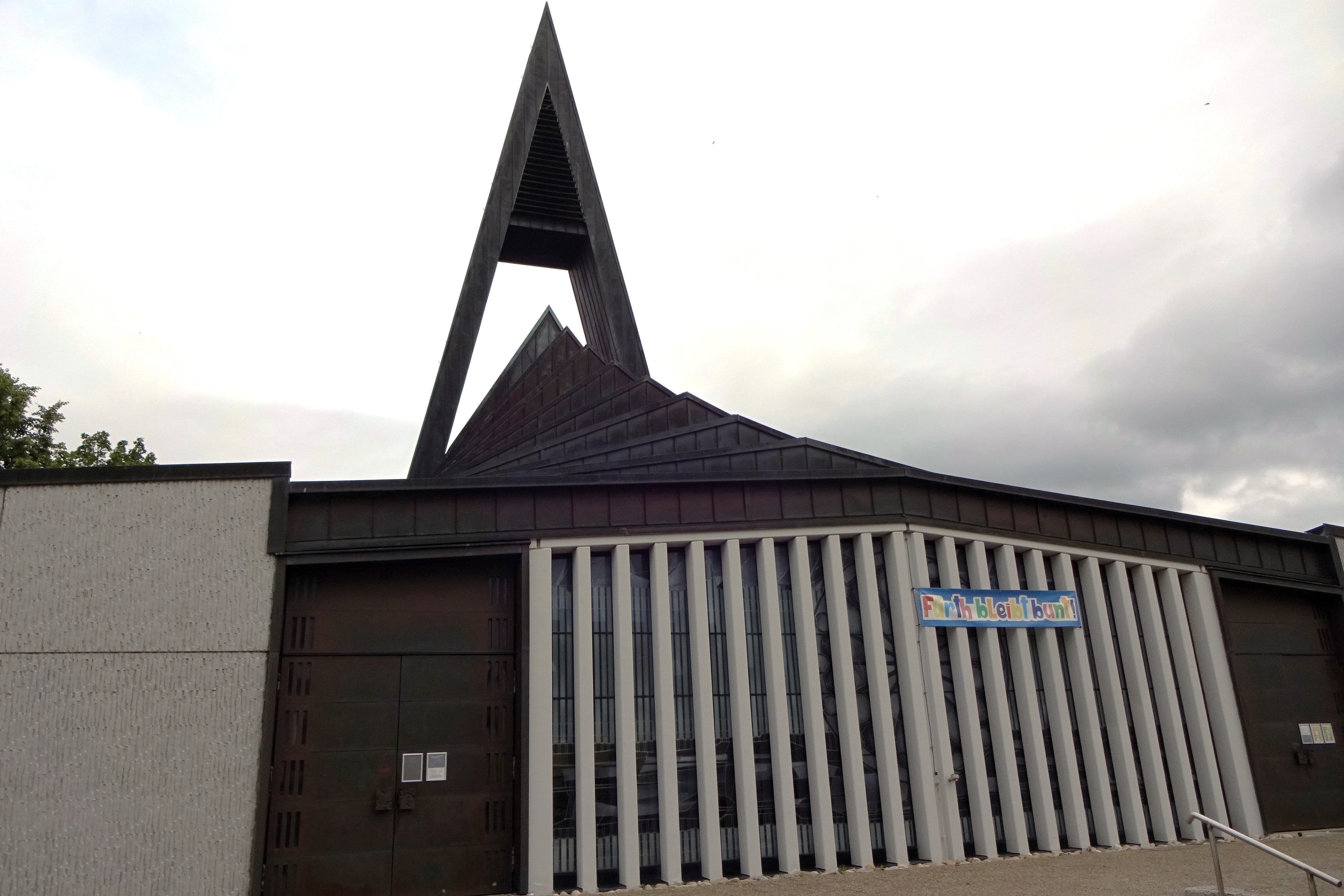 | Beschreibung | Kirche „Heiligste Dreifaltigkeit“ Eingangsseite mit prachtvoller Kupferblech Bedachung und Plakat "Fürth bleibt bunt", 2023 | ||