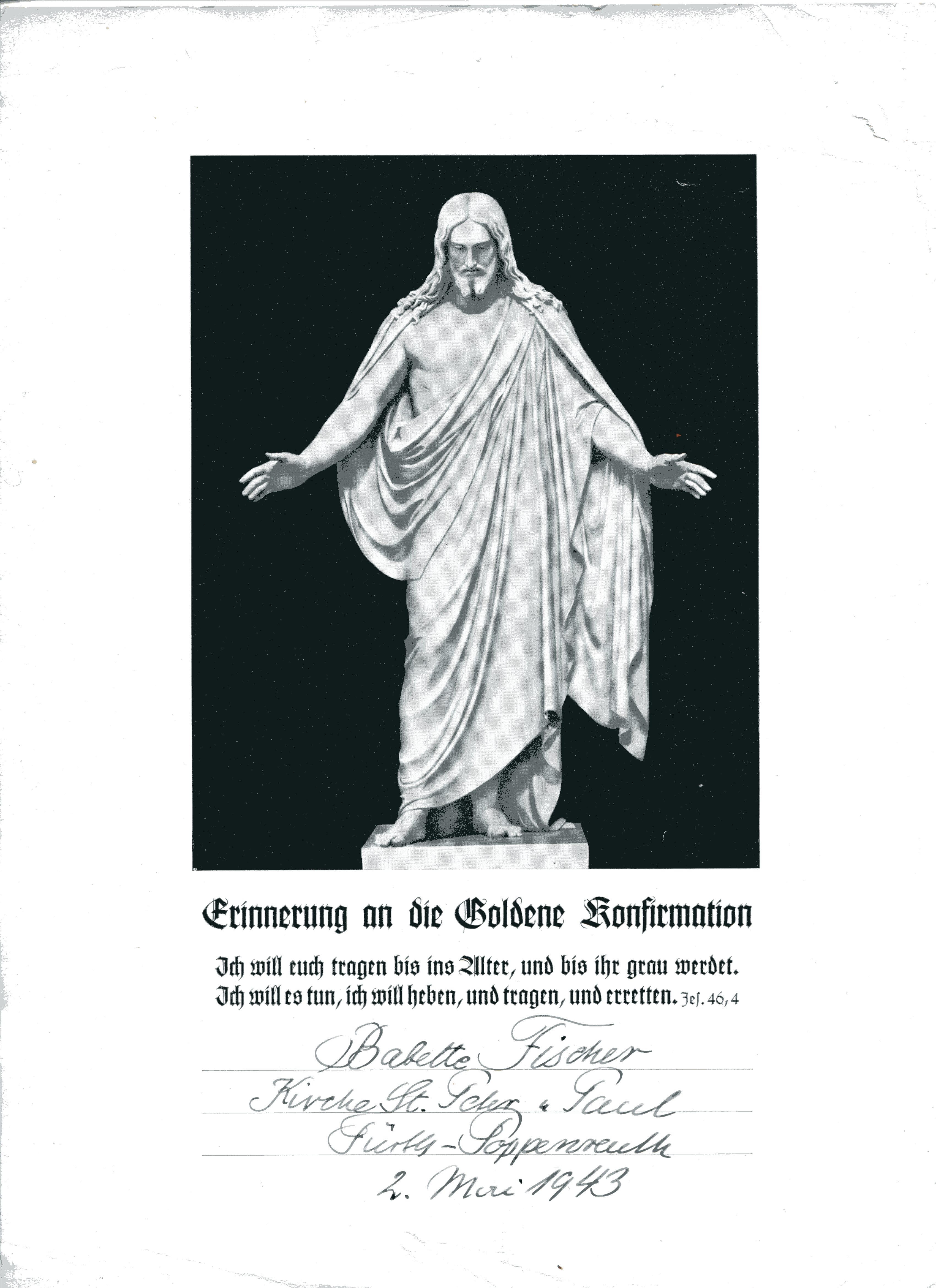| Beschreibung | Erinnerungsblatt zur Goldenen Konfirmation von Barbara Fischer in der Poppenreuther Kirche St. Peter und Paul vom 2 Mai 1943 | ||