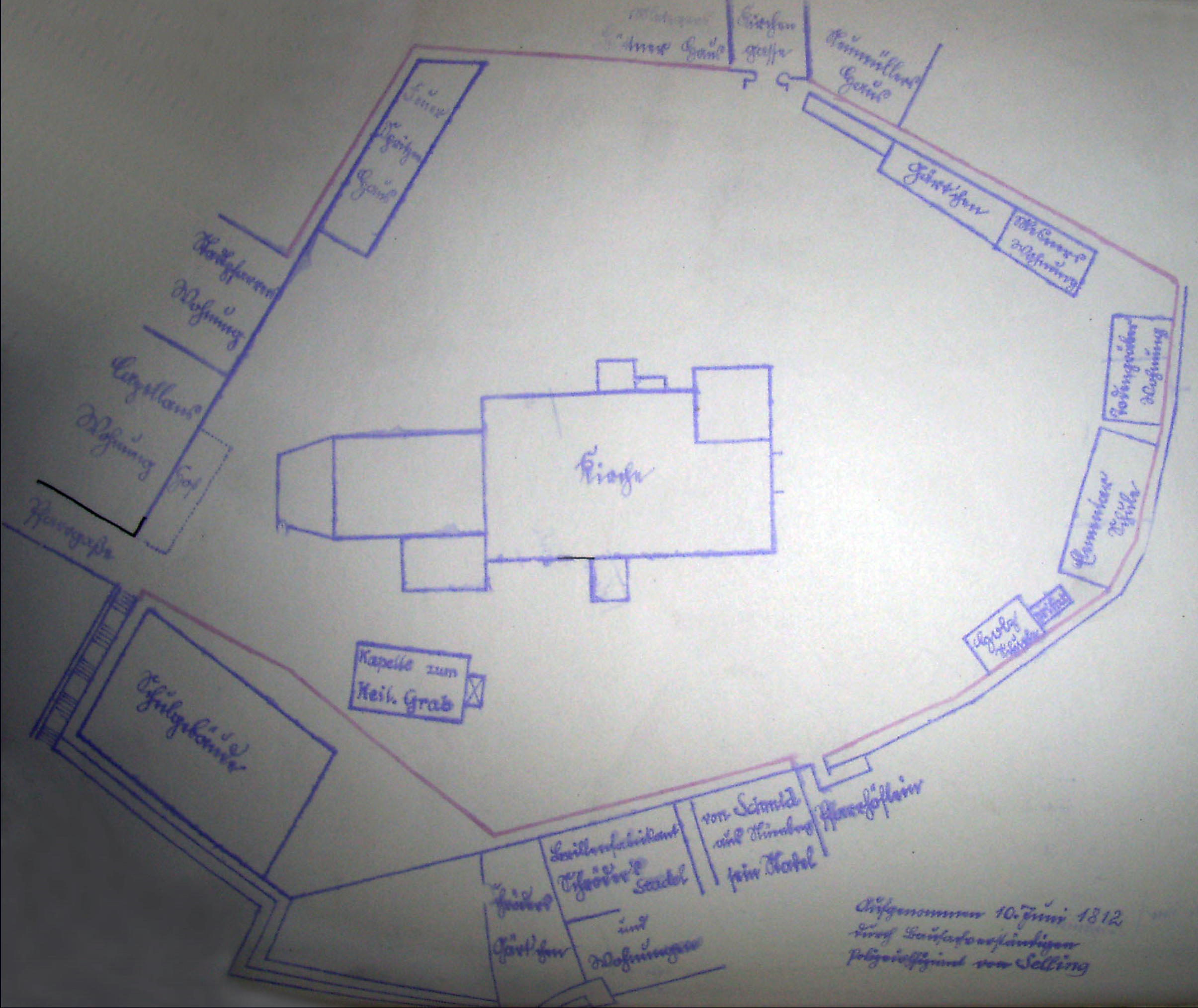 | Beschreibung | Kirchenplatz 1812, Plan vom Bausachverständigen Polizeioffiziant von Selling | ||
