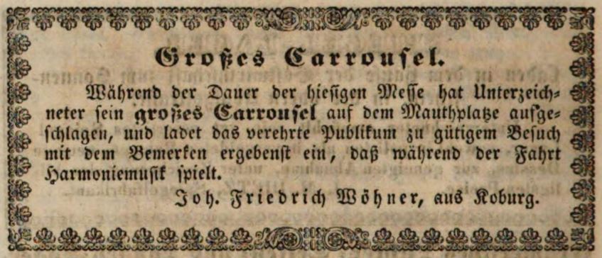 | Dateiinfo (Bild-Unterschrift und Info-Box, automatisch erstellt) | Werbung für ein "Großes Carrousel" auf der "Messe" (Kirchweih), September 1839 Lizenz: NoC-NC 1.0 | ||