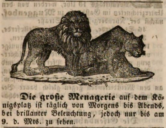 | Dateiinfo (Bild-Unterschrift und Info-Box, automatisch erstellt) | Werbeannonce für eine Menagerie bei der Kirchweih, Oktober 1844 Lizenz: NoC-NC 1.0 | ||