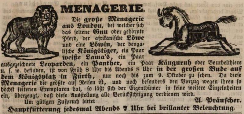 | Dateiinfo (Bild-Unterschrift und Info-Box, automatisch erstellt) | Werbeannonce für eine Menagerie bei der Kirchweih, Oktober 1844 Lizenz: NoC-NC 1.0 | ||