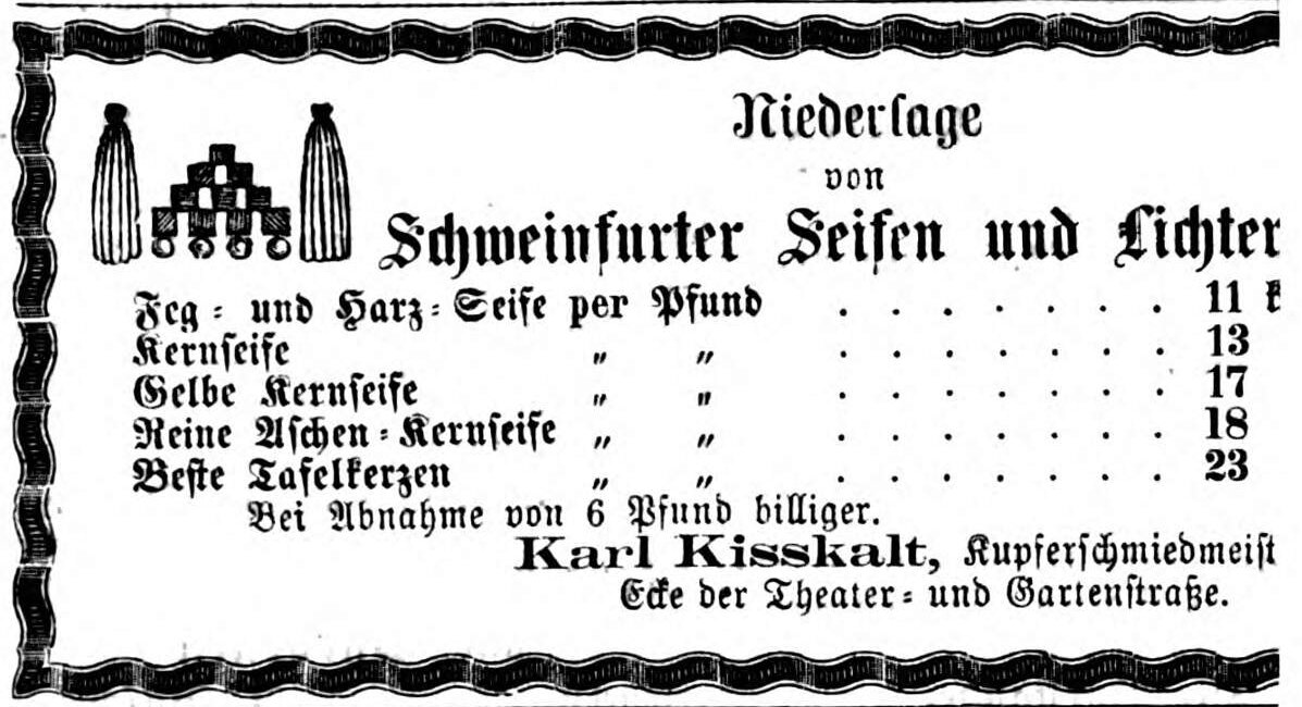 | Dateiinfo (Bild-Unterschrift und Info-Box, automatisch erstellt) | Werbeanzeige des Kupferschmiedmeisters Karl Kißkalt, Oktober 1863 Lizenz: NoC-NC 1.0 | ||