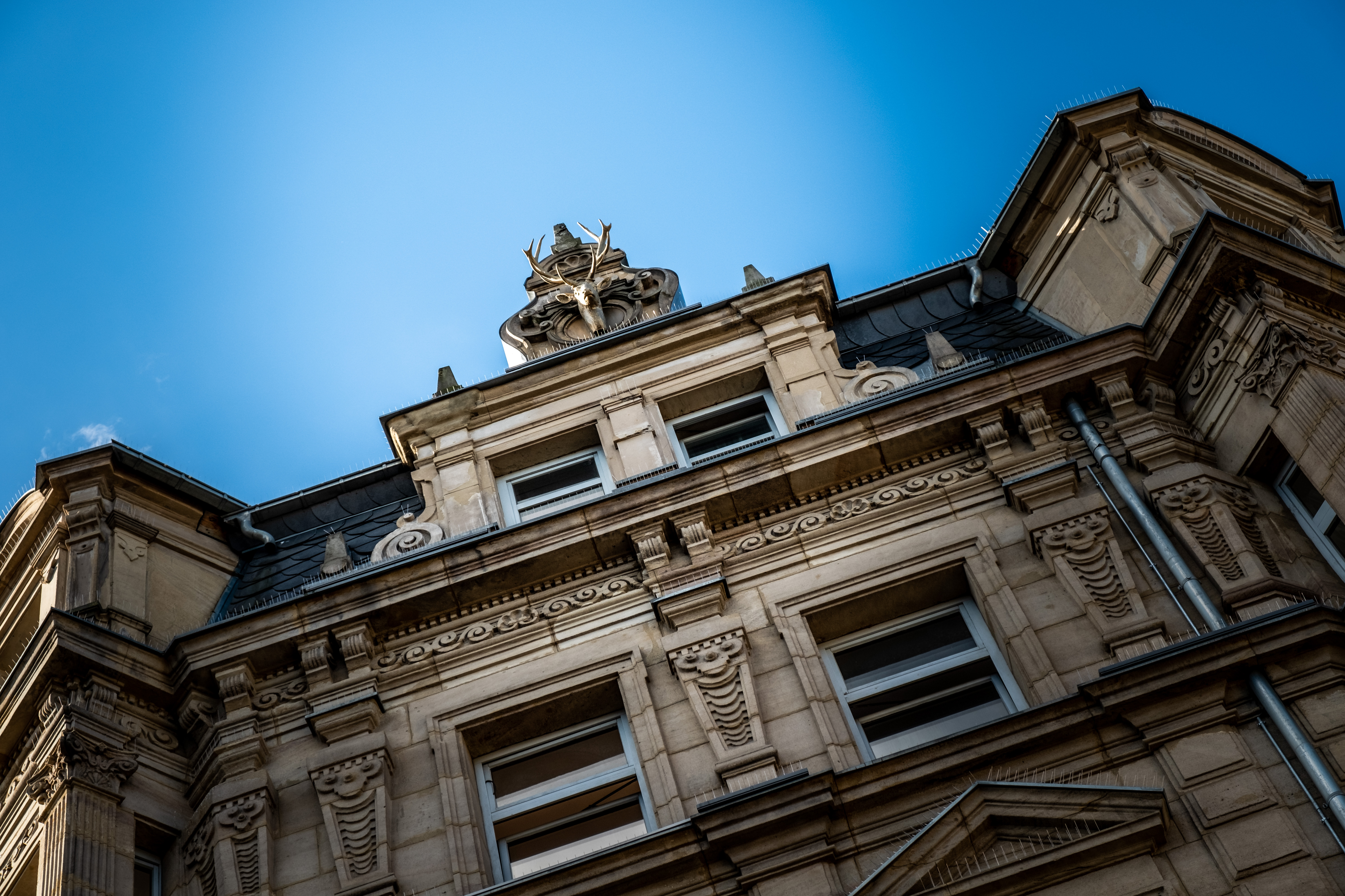 | Beschreibung | Hirschkopf am Giebel des Daches der Kleeblatt-Apotheke, 2020 | ||