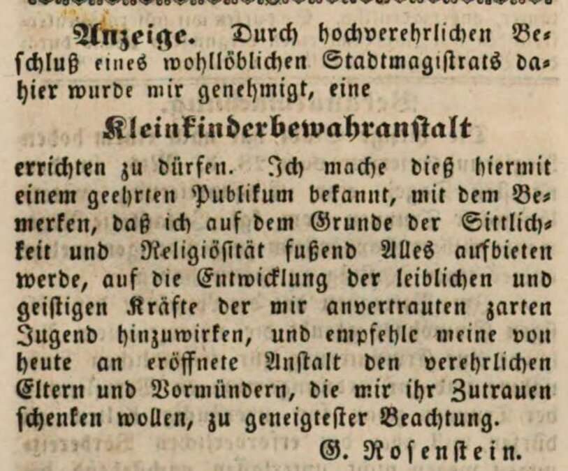 | Beschreibung | Zeitungsanzeige von G. Rosenstein bezügl. der Errichtung einer Kleinkinderbewahranstalt, April 1848 | ||