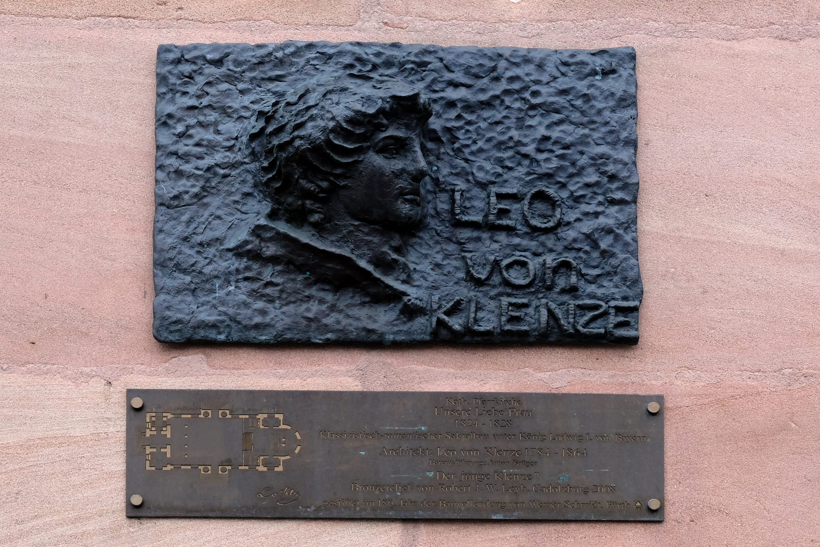 | Beschreibung | Tafel an der Kirche "Unsere Liebe Frau", Architekt Leo von Klenze, Bronzerelief von Robert J. W. Leyh aus Cadolzburg 2008 | ||