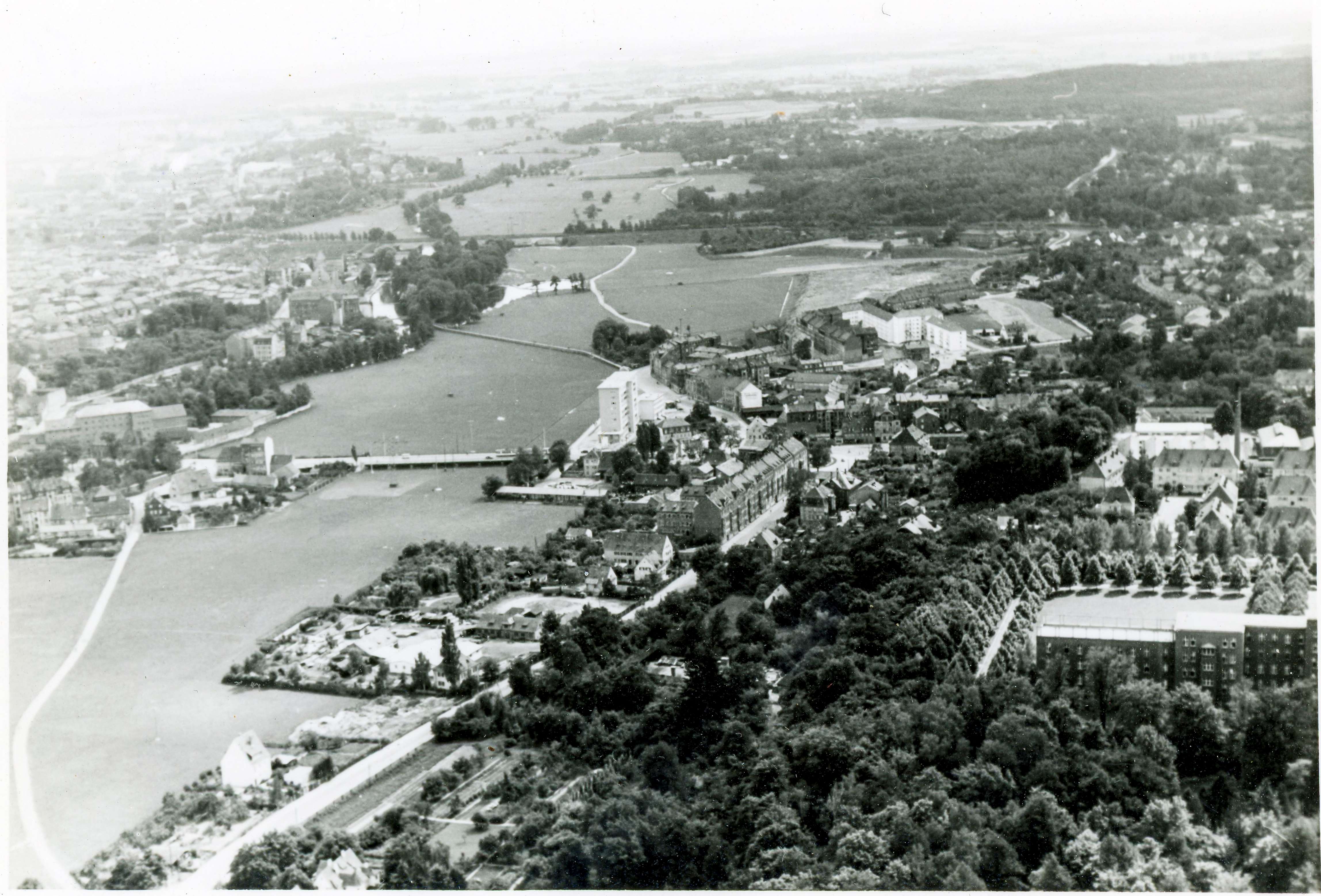 | Beschreibung | Luftaufnahme aus dem Stadtwesten - rechts im Bild das Klinikum Fürth und die Berg Bräu - im Vordergrund die Vacher Straße, in der Bildmitte die Billinganlage und links die Foerstermühle, ca. 1954 | ||
