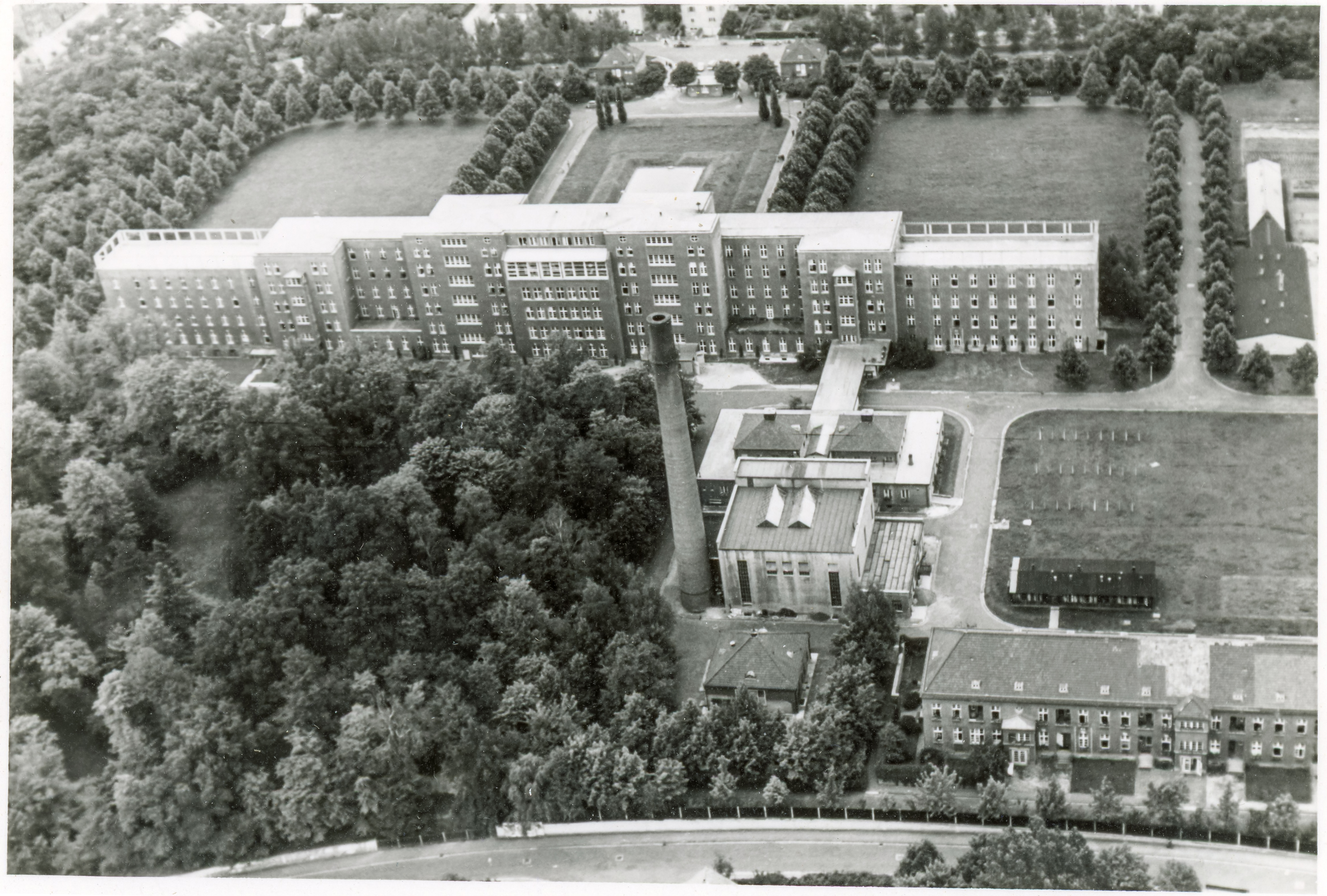 | Beschreibung | Luftaufnahme des vom Norden Klinikum Fürth - im Bild das Hauptgebäude, Technik- und Rückgebäude und ehem. Küche sowie die ehem. Pathologie, 1955 | ||
