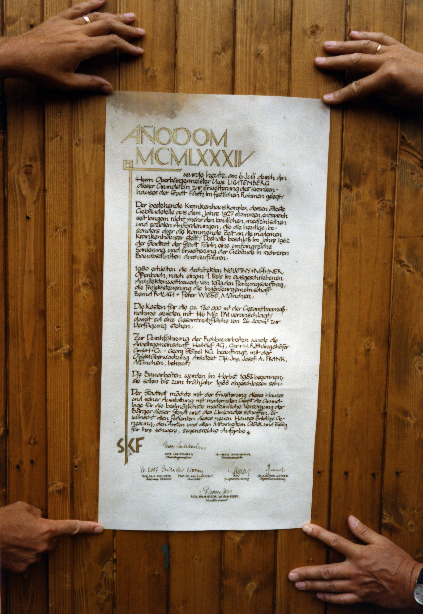 | Beschreibung | Urkunde für die Zeitkapsel im Grundstein des Klinikum Fürth, Juli 1984 | ||