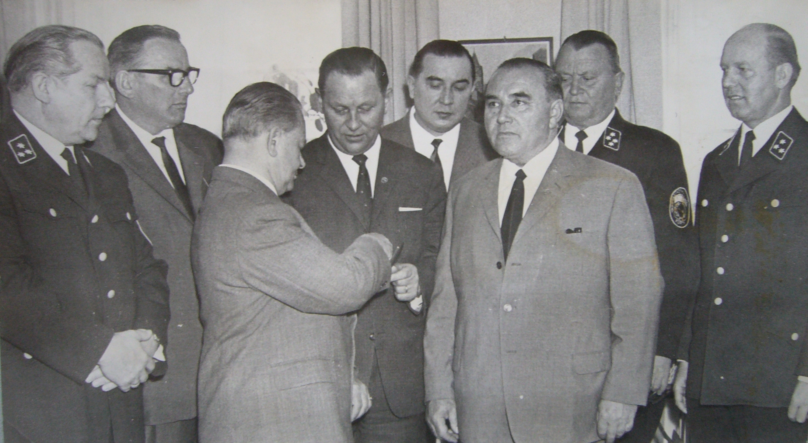| Beschreibung | Vertreter der Fürther Stadtpolizei. V.l.: Lodes, Matthäus Rotter, Unbekannt, Herbert Mielsch, Walter Klose, unbekannt, Gustav Kirchner, Georg Fritz (29. April 1967) | ||
