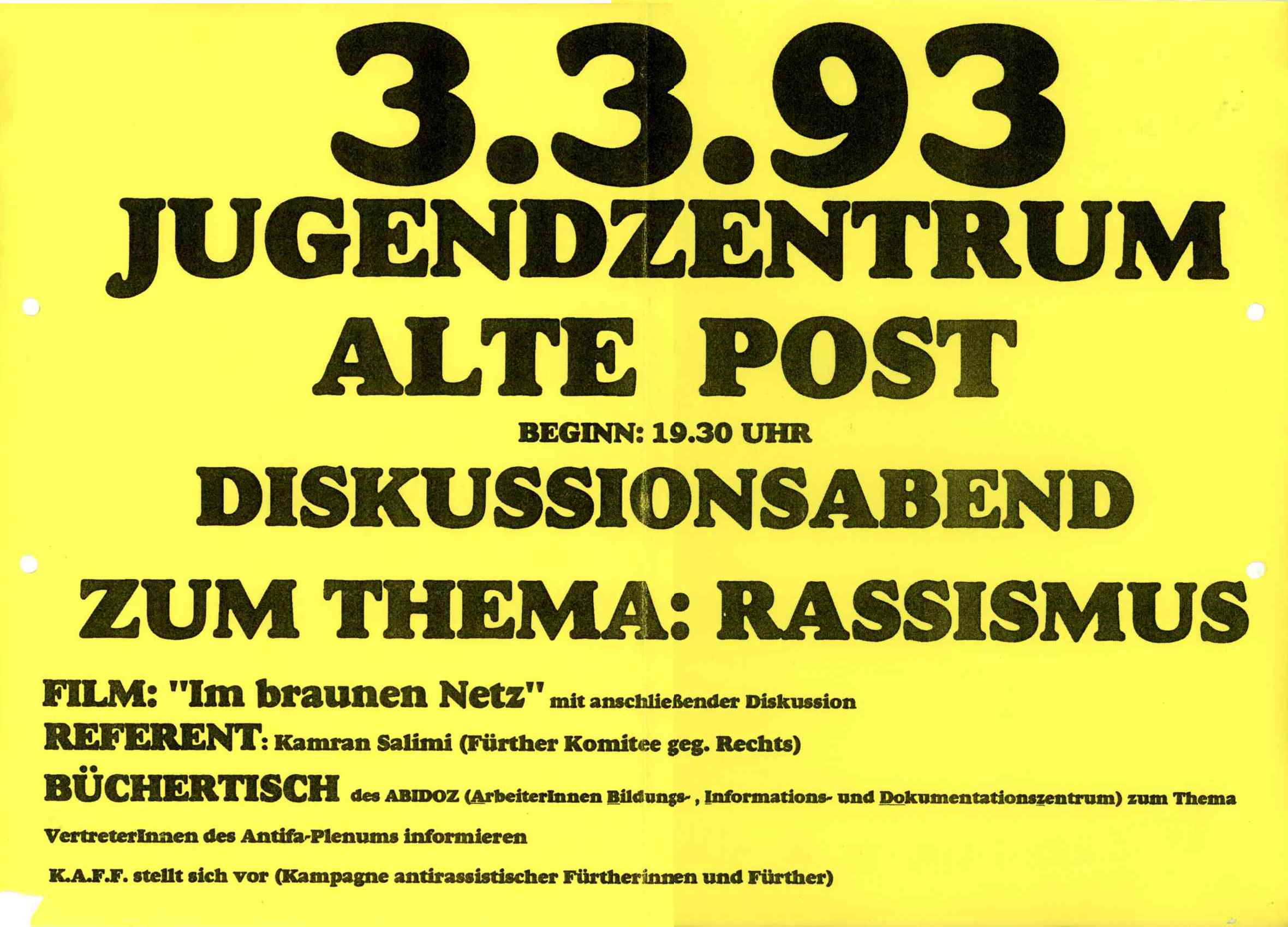 | Beschreibung | Veranstaltungsposter des Komitees gegen Rechtsradikalismus in Fürth, Mrz 1993 | ||