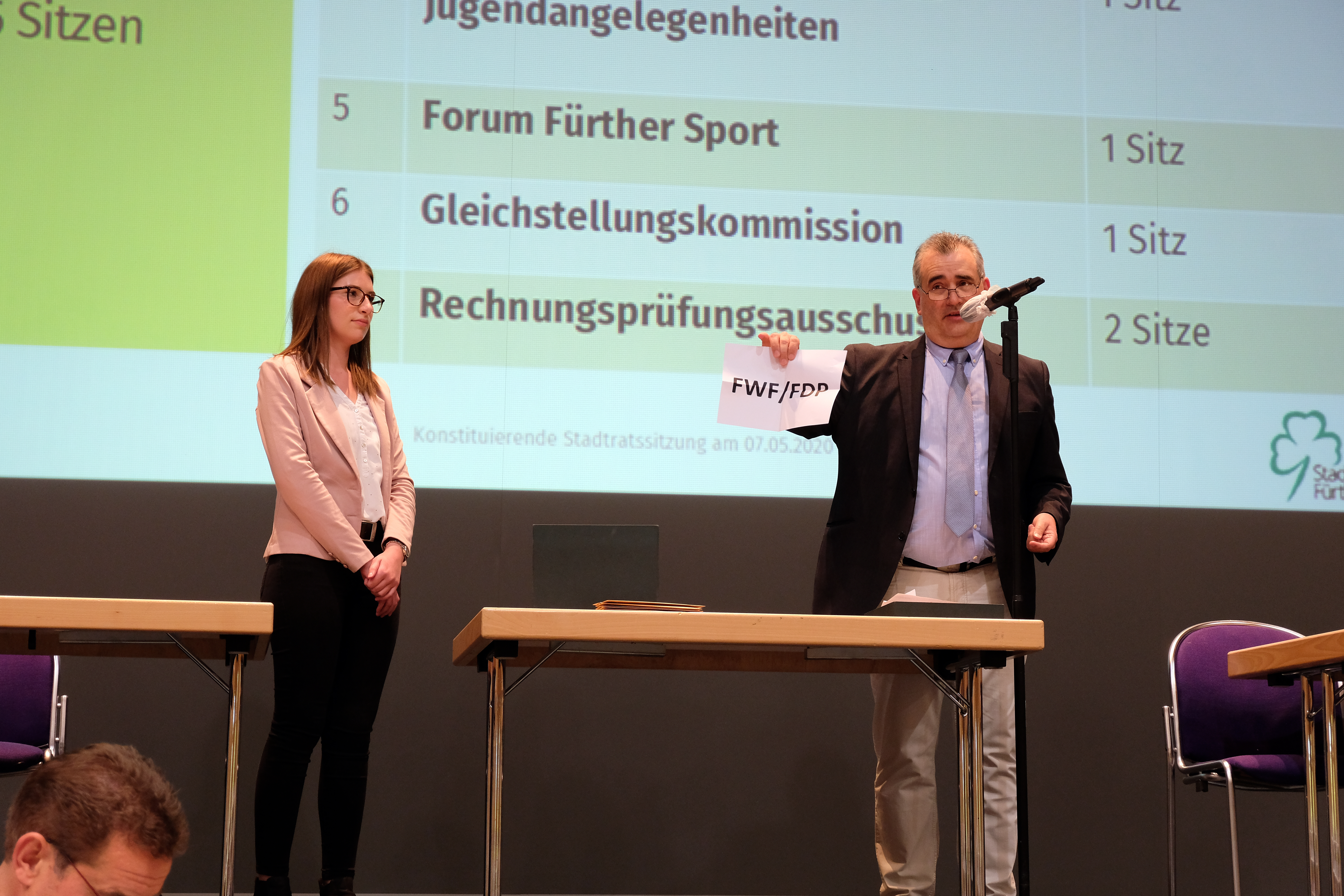 | Dateiinfo (Bild-Unterschrift und Info-Box, automatisch erstellt) | Losentscheid über Sitzverteilung in den Ausschüssen und Gremien des Stadtrates, Mai 2020 Urheber: Kamran Salimi<br><br>Lizenz: CC BY-SA 3.0 | ||