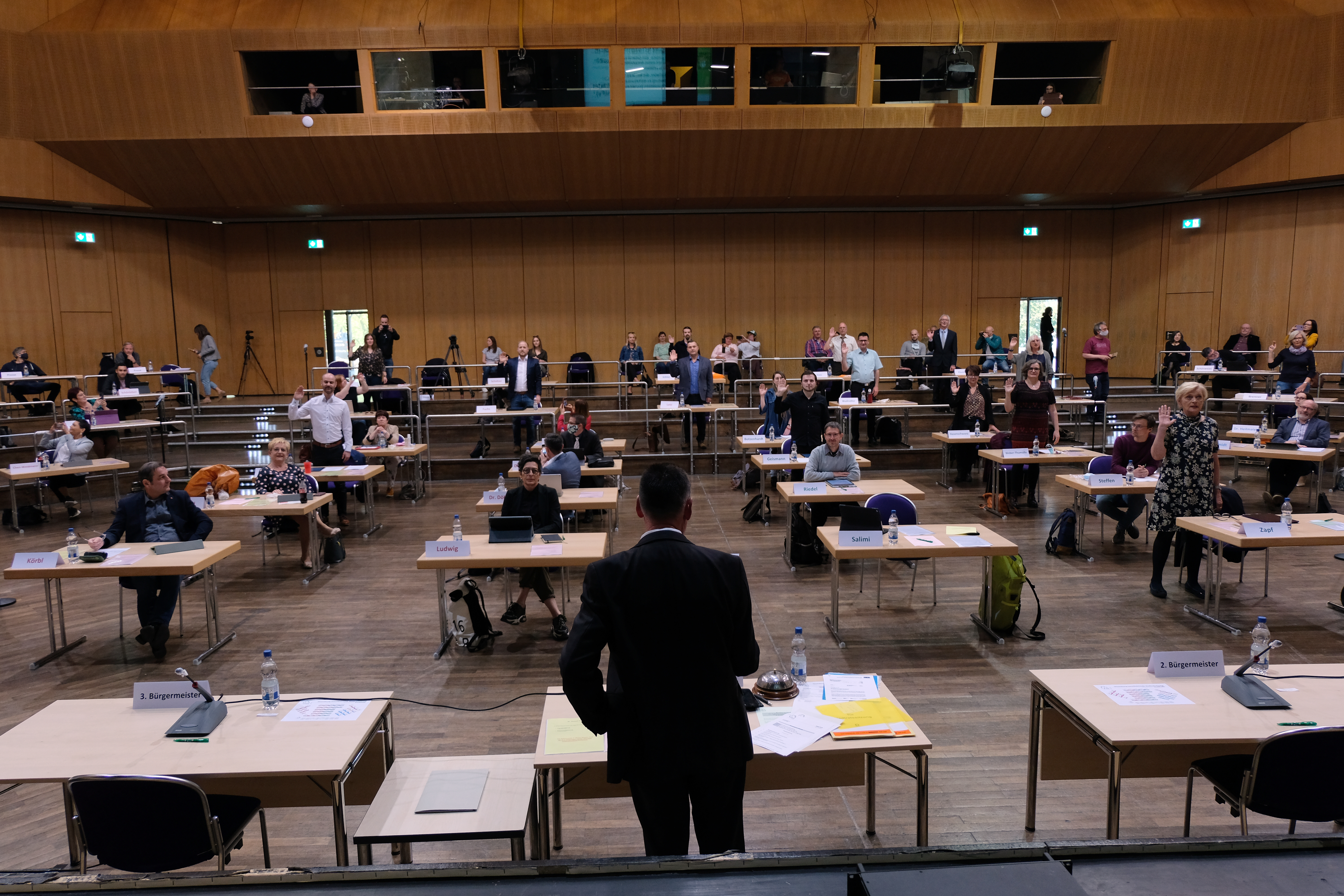 | Beschreibung | Vereidigung der neu gewählten Stadträte während der konstituierende Stadtratssitzung in der Stadthalle als Ausweichort für den Ratshaussaal aufgrund der COVID-19-Pandemie, Mai 2020 | ||