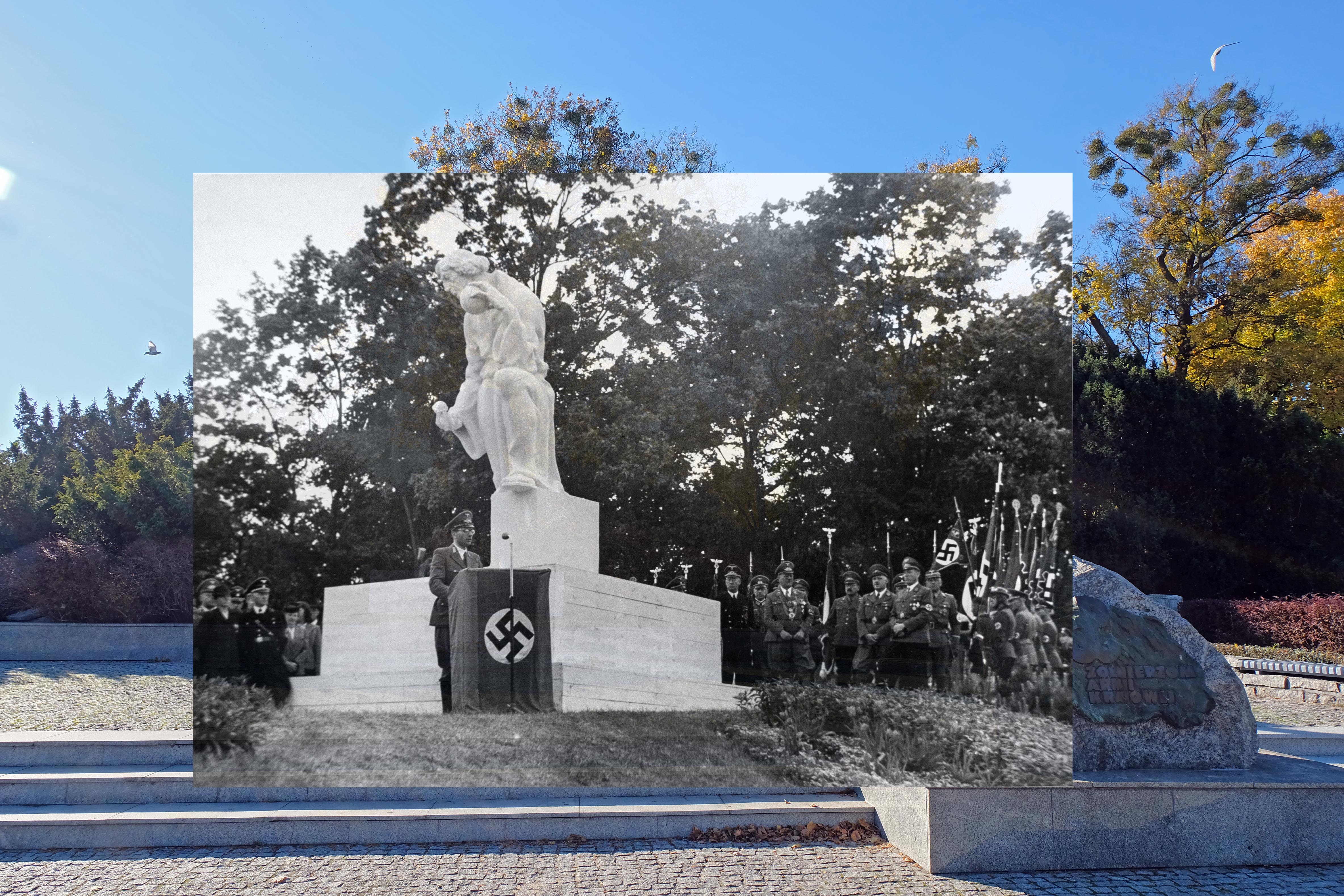 | Beschreibung | Grundsteinlegung zum Kopernikus-Denkmal im ehem. Thorn (heute Toruń) im Mai 1943, am Rednerpult Dr. Adolf Schwammberger, im Hintergrund OB Franz Jakob und Gauleiter Albert Forster. Fotomontage mit Zustand 2018 | ||