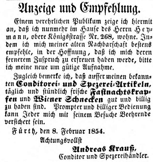 | Beschreibung | Zeitungsannonce des Konditors Andreas Krauß, Februar 1854 | ||