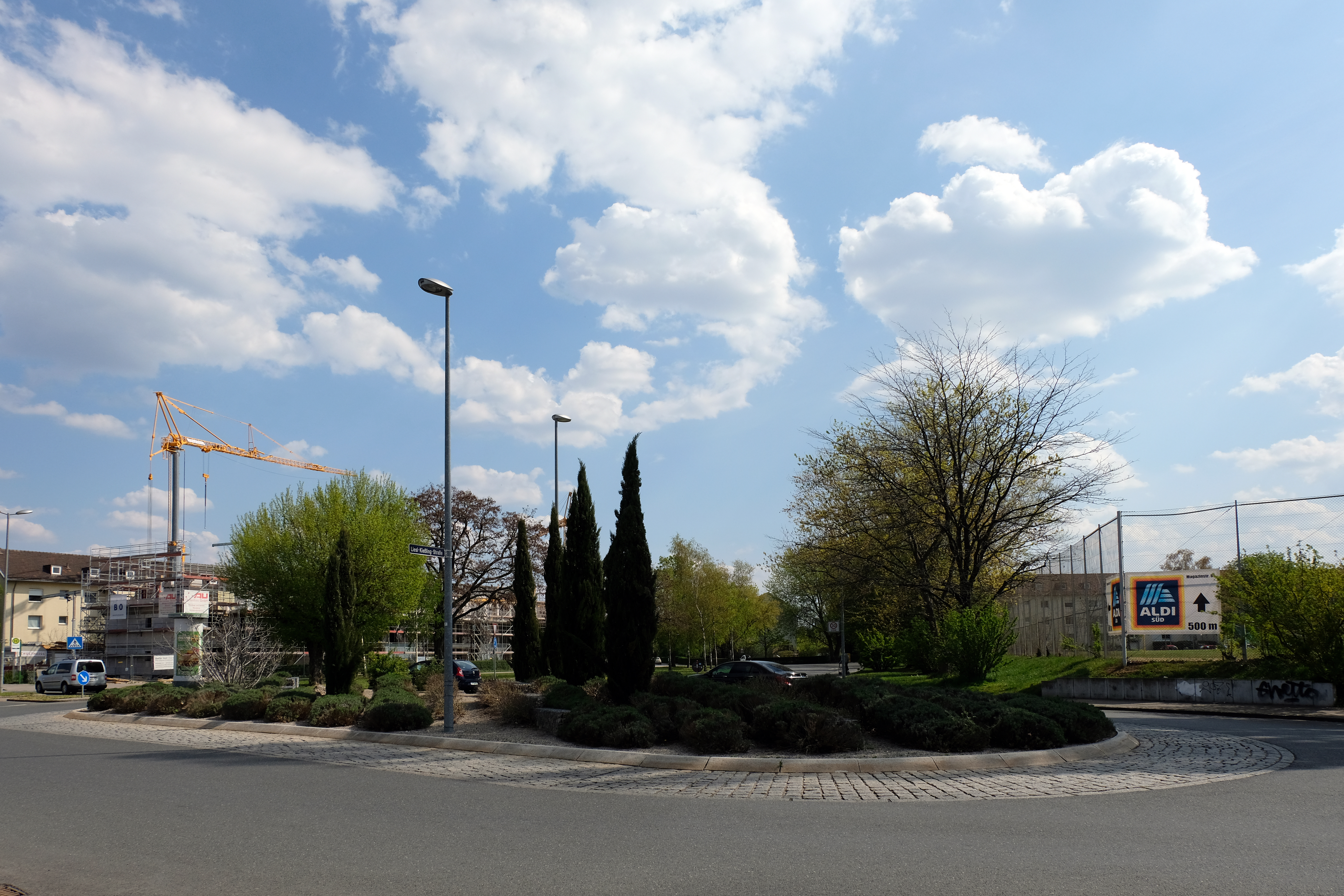 | Dateiinfo (Bild-Unterschrift und Info-Box, automatisch erstellt) | Kreisverkehr Fronmüllerstraße / Liesl-Kiesling-Straße / Magazinstraße, April 2020 Lizenz: CC BY-SA 3.0 | ||