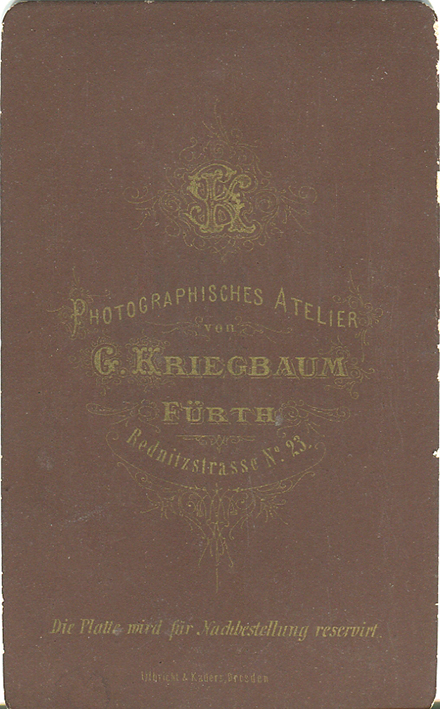 | Dateiinfo (Bild-Unterschrift und Info-Box, automatisch erstellt) | Rückseite einer Fotografie vor der Jahrhundertwende Urheber: G. Kriegbaum<br><br>Lizenz: CC BY-SA 3.0 | ||