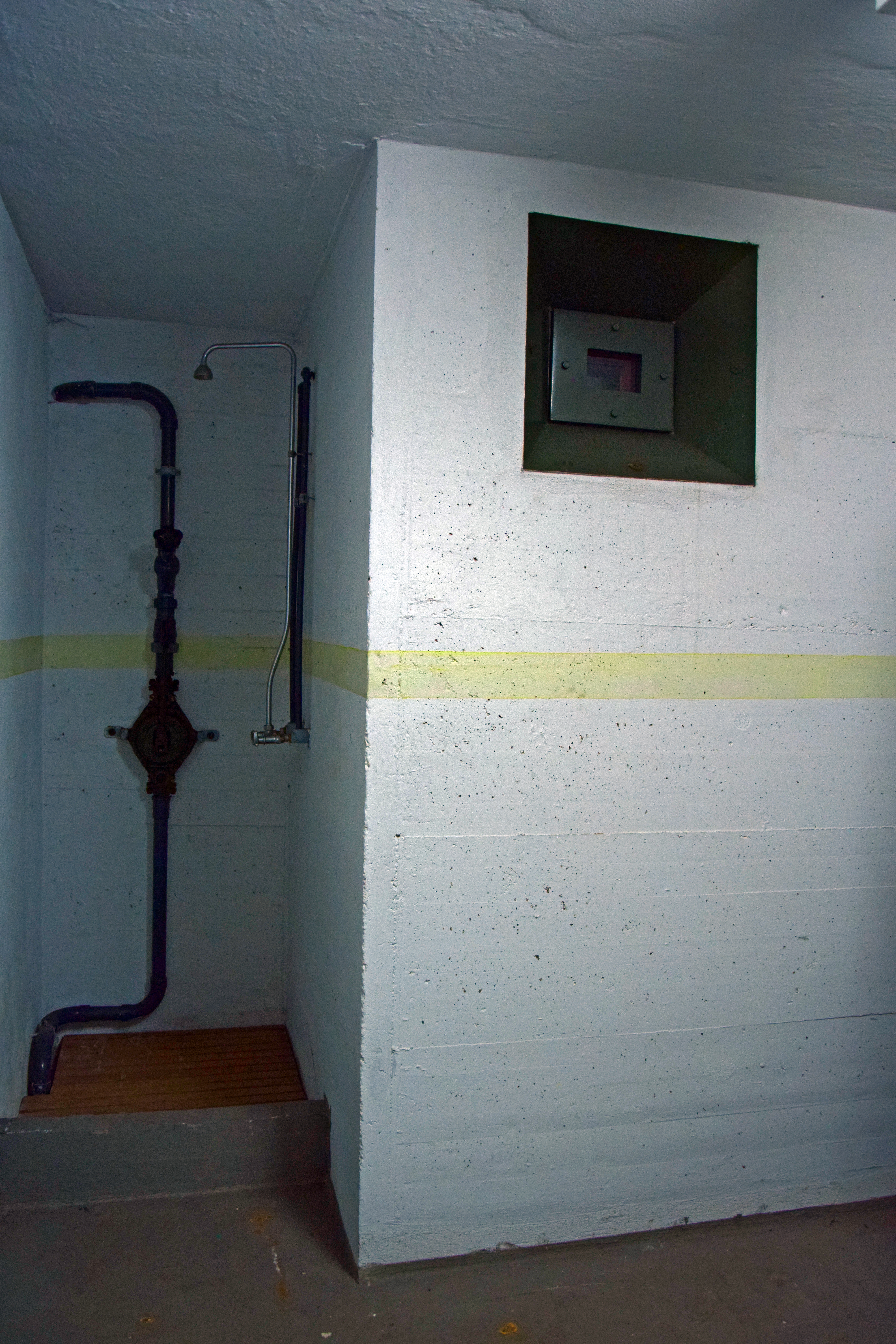 | Beschreibung | Sichtfenster von Innen nach "Außen" in den Schleusenraum - links mit Dusche um Kontaminationen abwaschen zu können - im Kronacher Bunker, August 2019 | ||