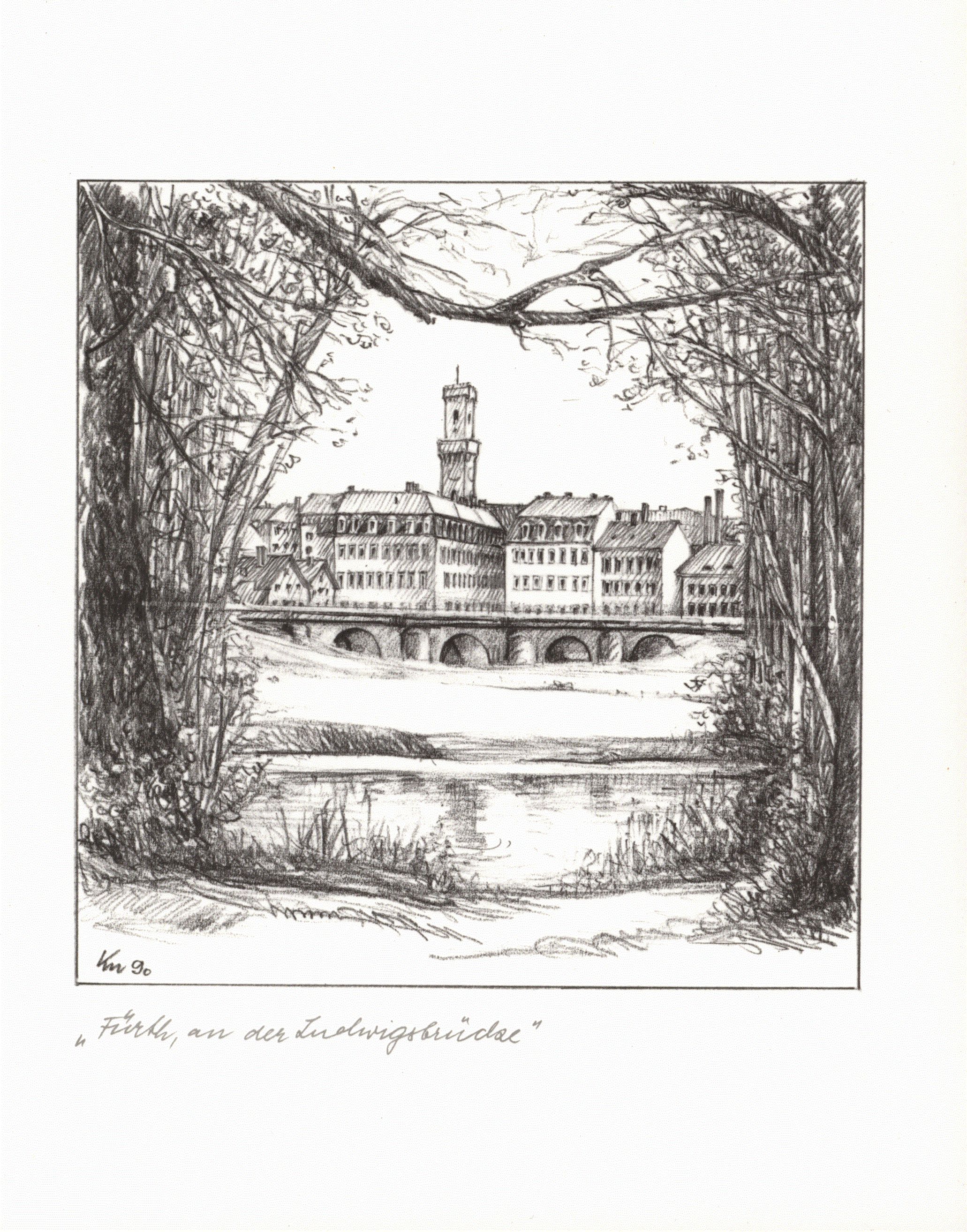 | Beschreibung | Die Ludwigbrücke mit Teilen der Altstadt, gezeichnet von Heinrich Kuchenreuther, erstellt um 1990 | ||
