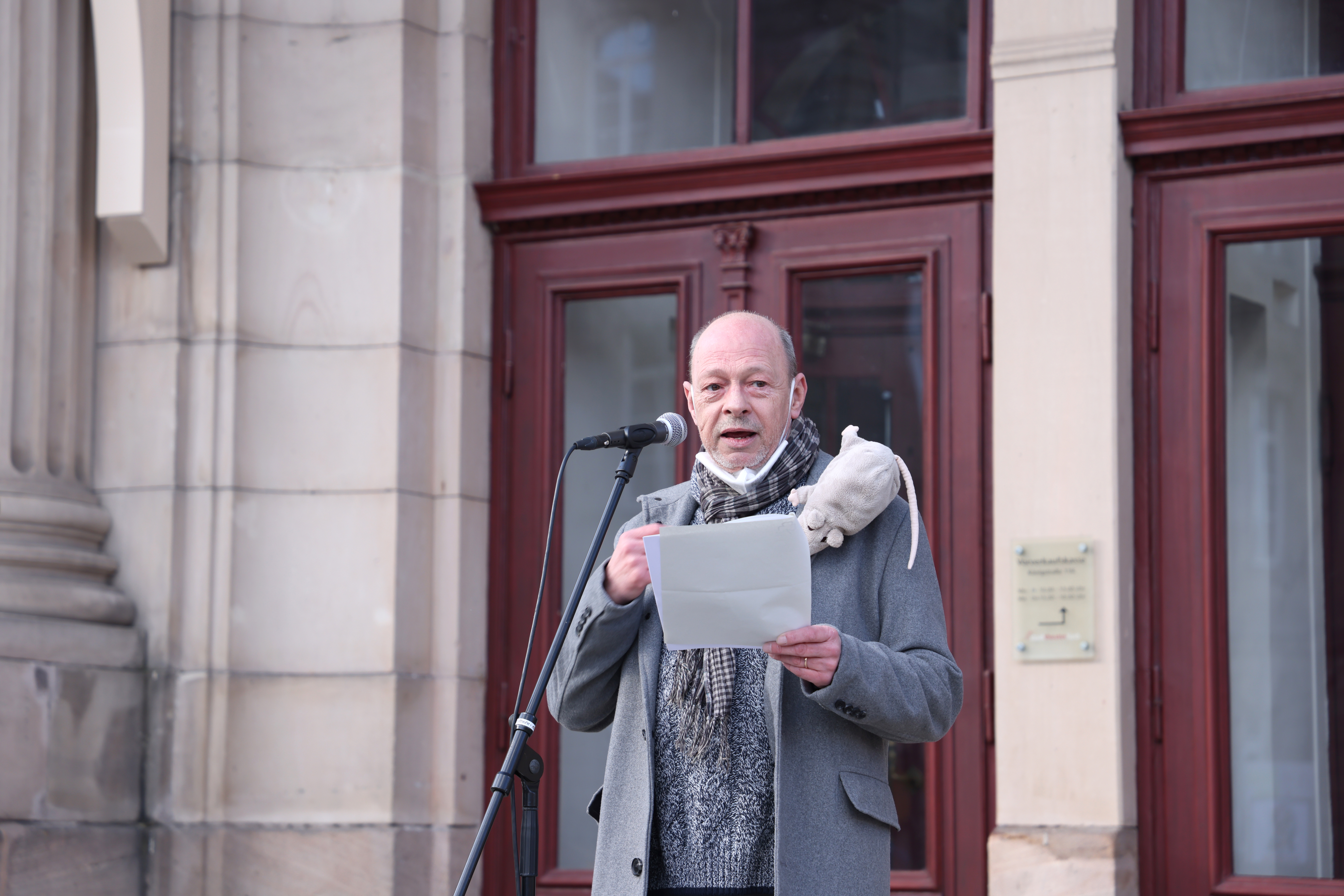 | Beschreibung | Uwe Weiherer als Redner bei einer Kundgebung für die Kulturschaffenden während der COVID-19-Pandemie, Feb. 2022 | ||