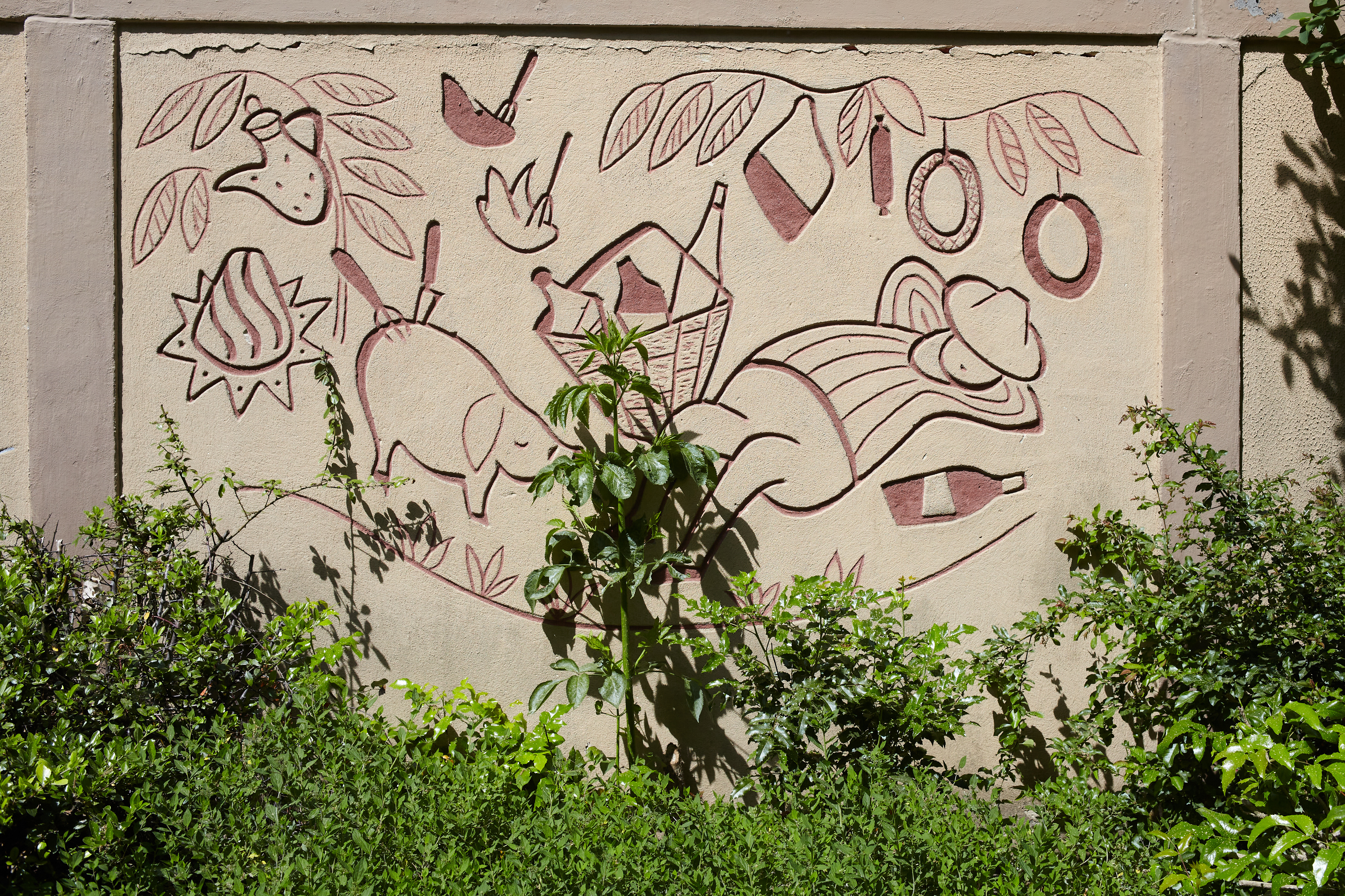 | Beschreibung | Sgraffito-Märchenwand von Gudrun Kunstmann in der Hardstr. 104, ca. 1962, Detail „Das Schlaraffenland“ | ||