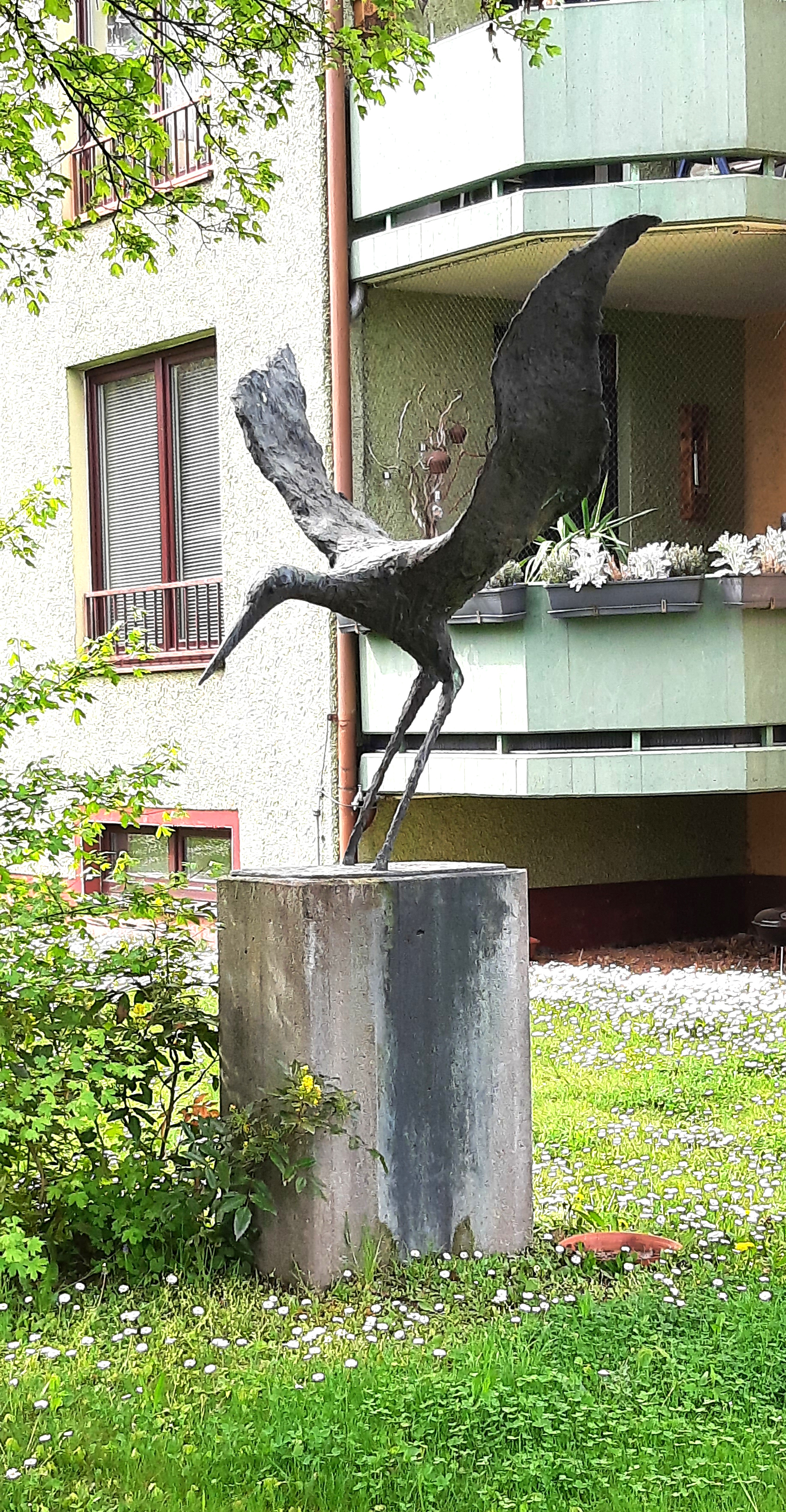 | Beschreibung | Freiplastik vor Obermichelbacher Str. 8, Landender Storch, Gudrun Kunstmann (signiert GK), Bronzeguss, Zustand April 2024 | ||