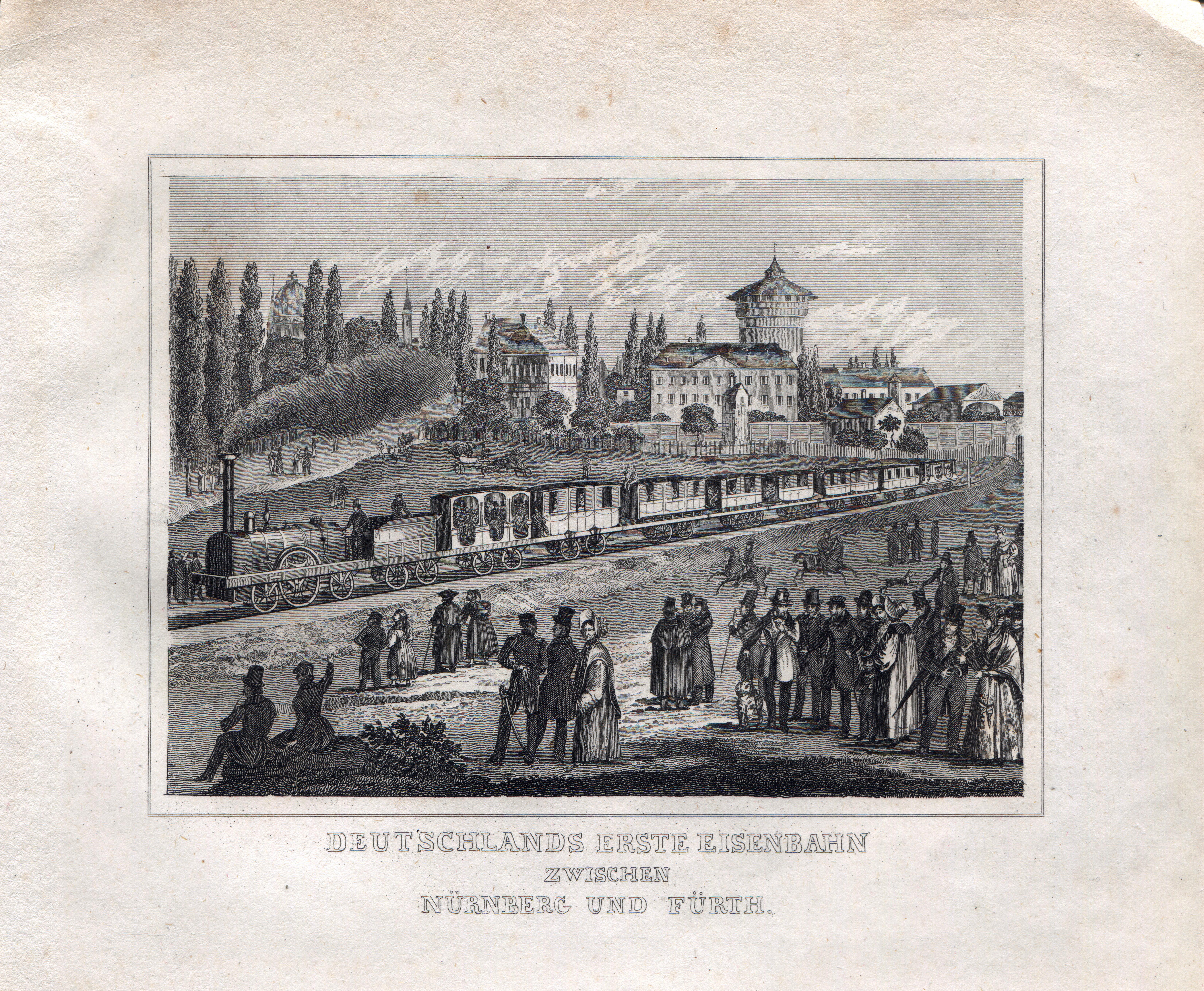 | Beschreibung | Kupferstich der Ludwigseisenbahn bei der Jungfernfahrt Richtung Fürth aus Nürnberg, 1835 | ||