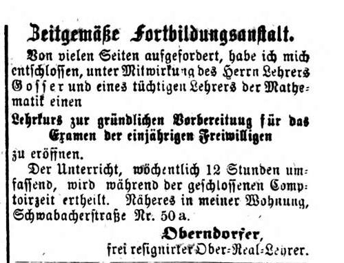 | Beschreibung | "Nachhilfekurs" für Vorbereitung auf Einjähriges, Fürther Tagblatt 18.3.1868 | ||