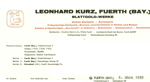 | Beschreibung | Historischer Briefkopf der Fa. Leonhard Kurz von 1958 | ||